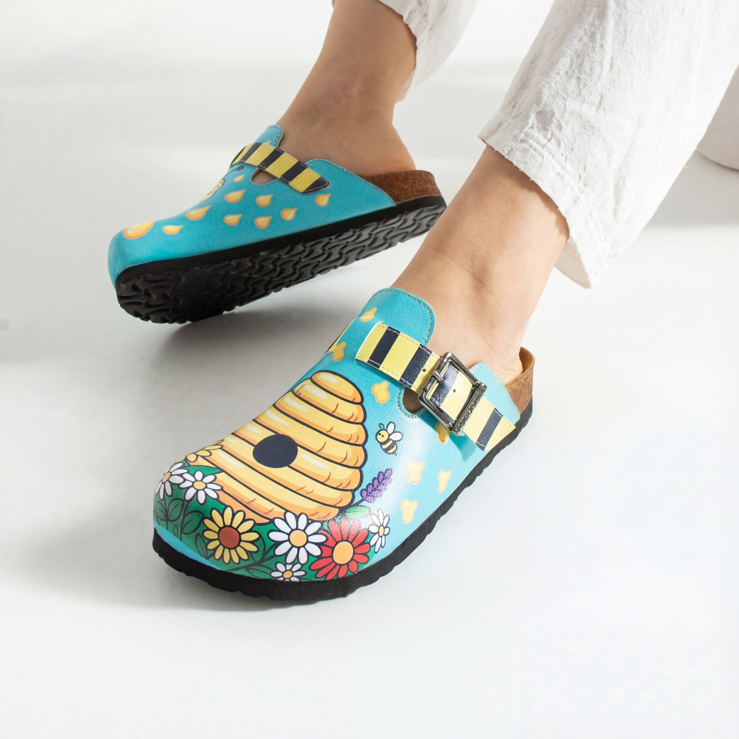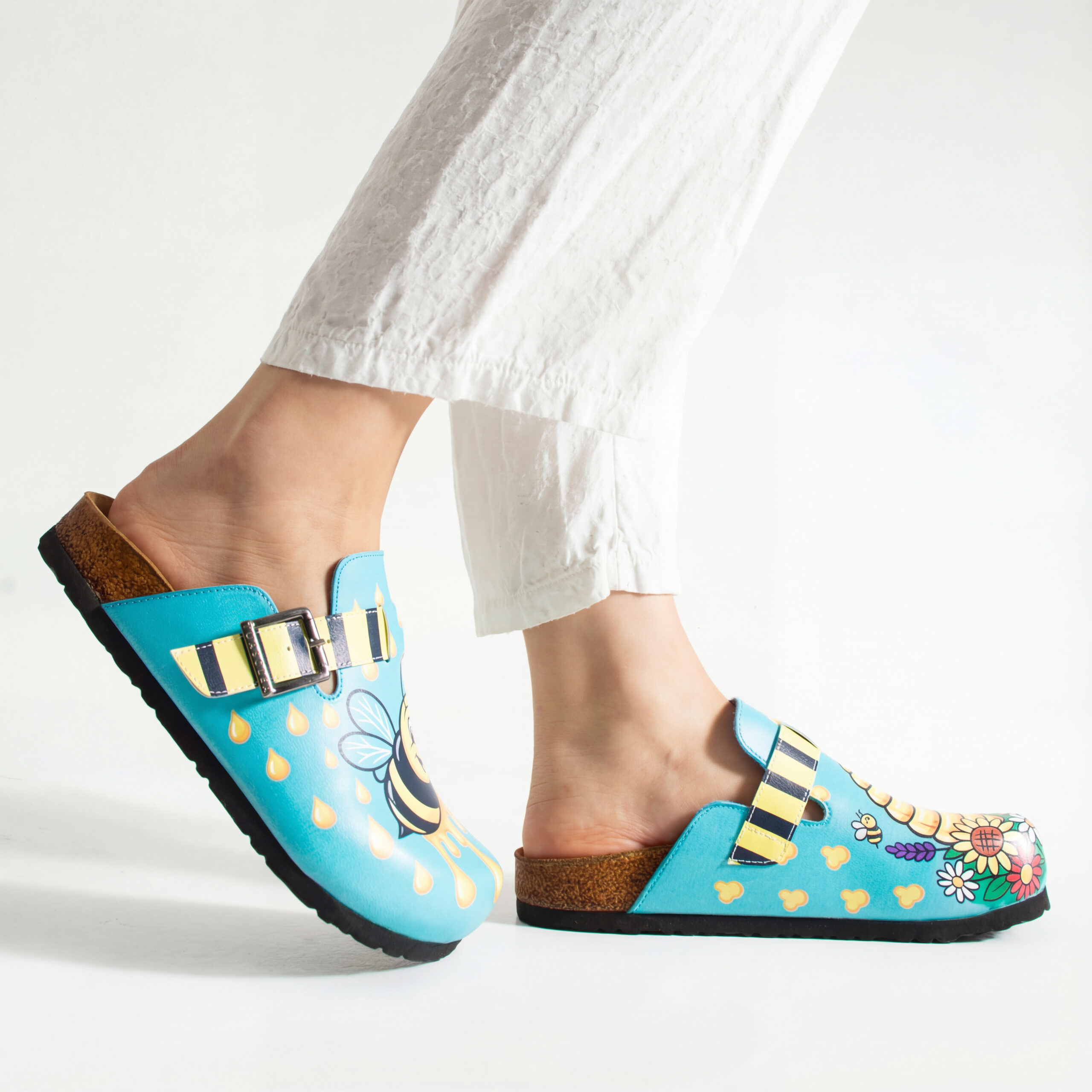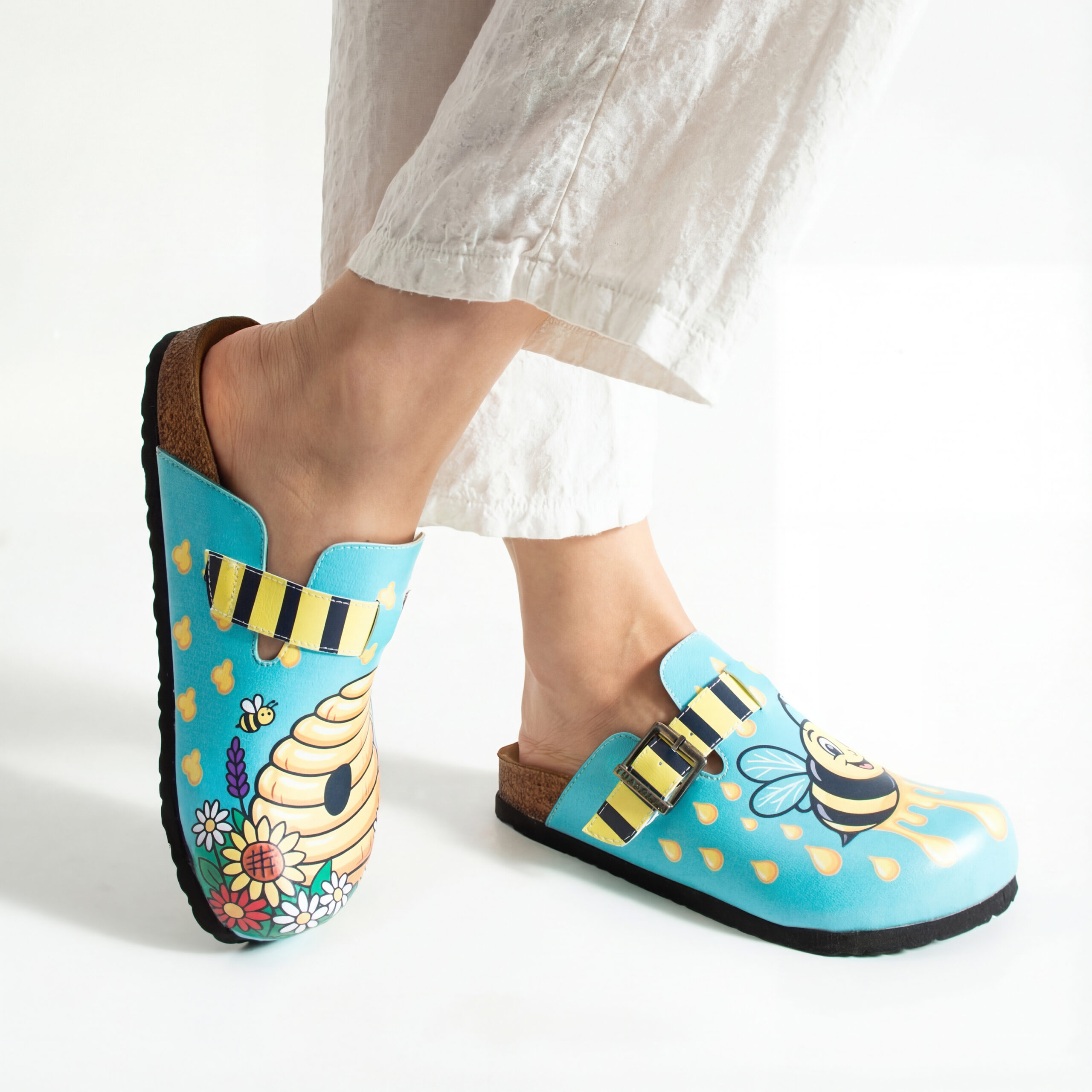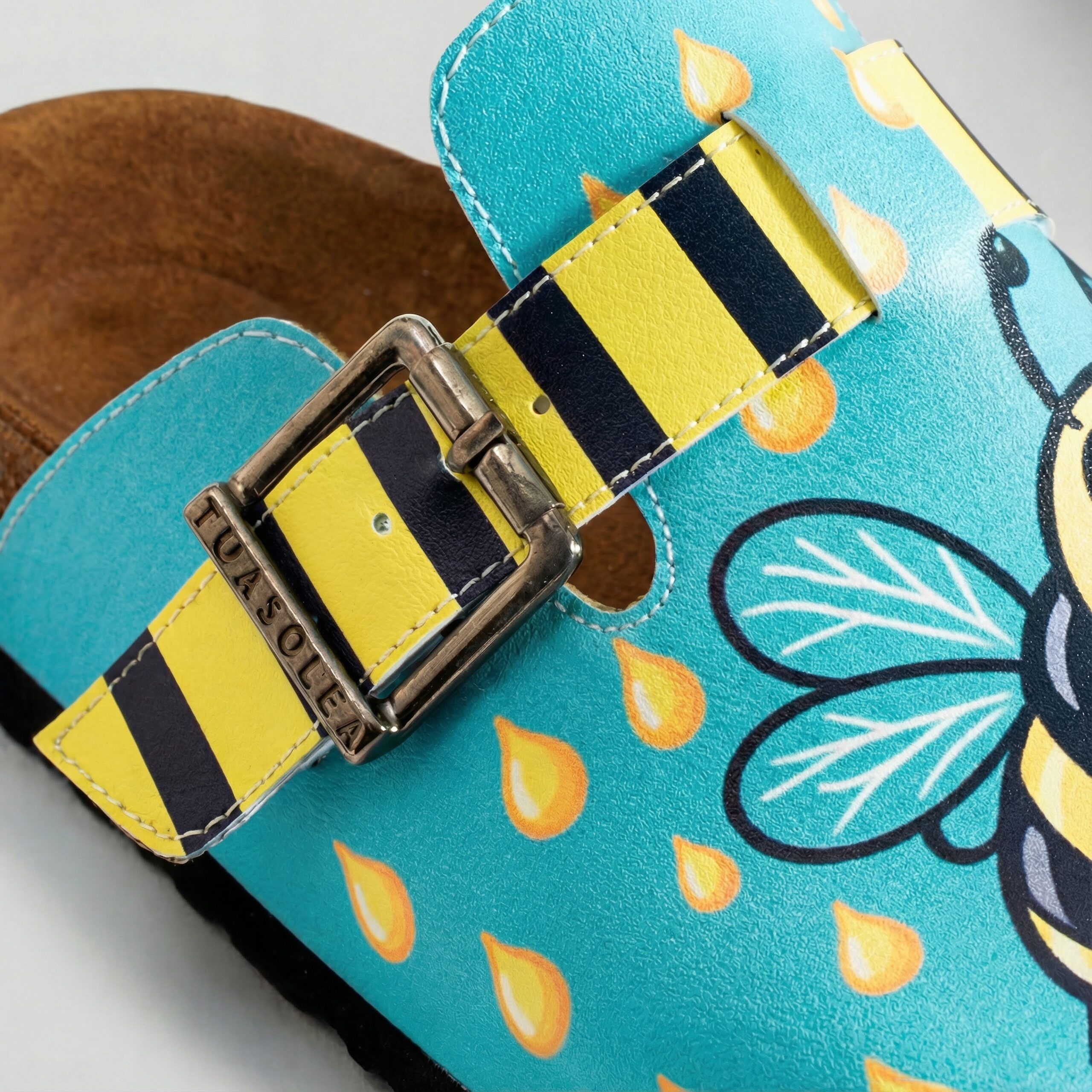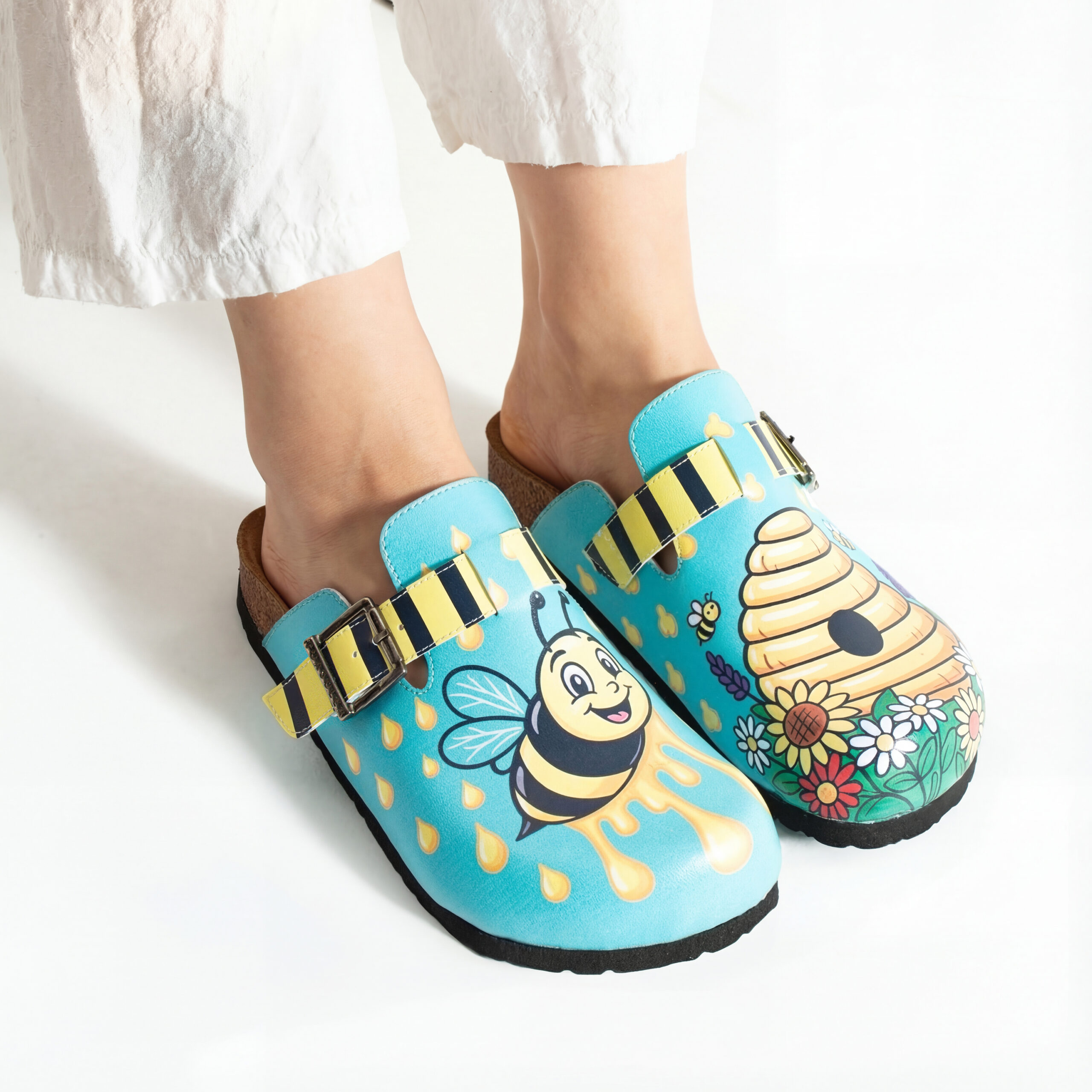 Чехлите са изработени от висококачествена еко кожа, устойчива на напукване и деформация, с дълготраен UV печат с пчелен мотив, който запазва ярките си цветове дори при редовна употреба. Ортопедичната подметка осигурява стабилна опора и равномерно разпределение на натоварването при ходене и стоене, а стелката от микрофибър е мека, приятна на допир, не запарва и предотвратява приплъзване.