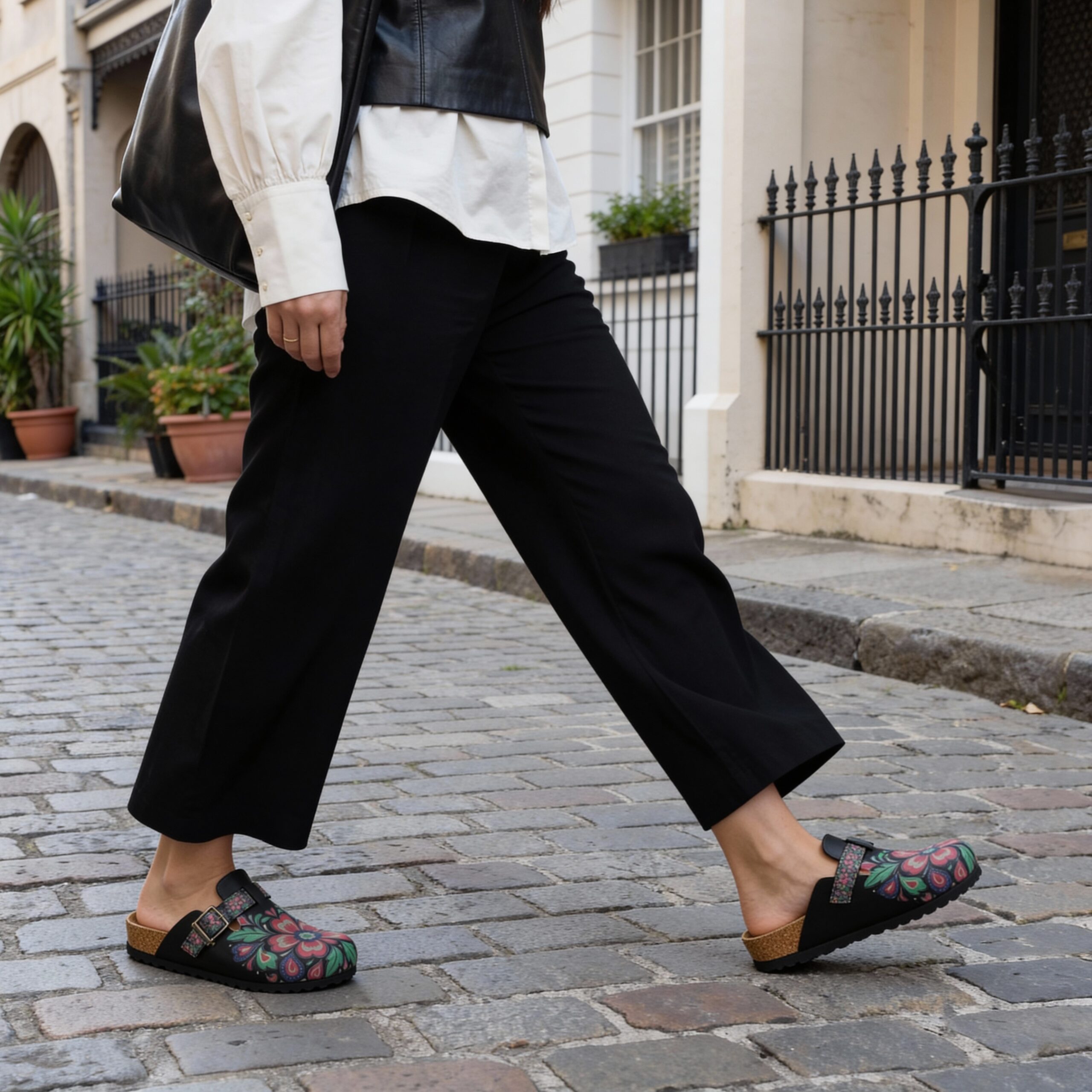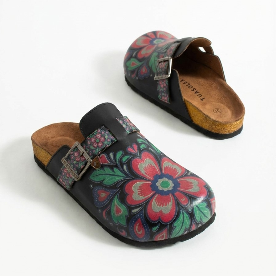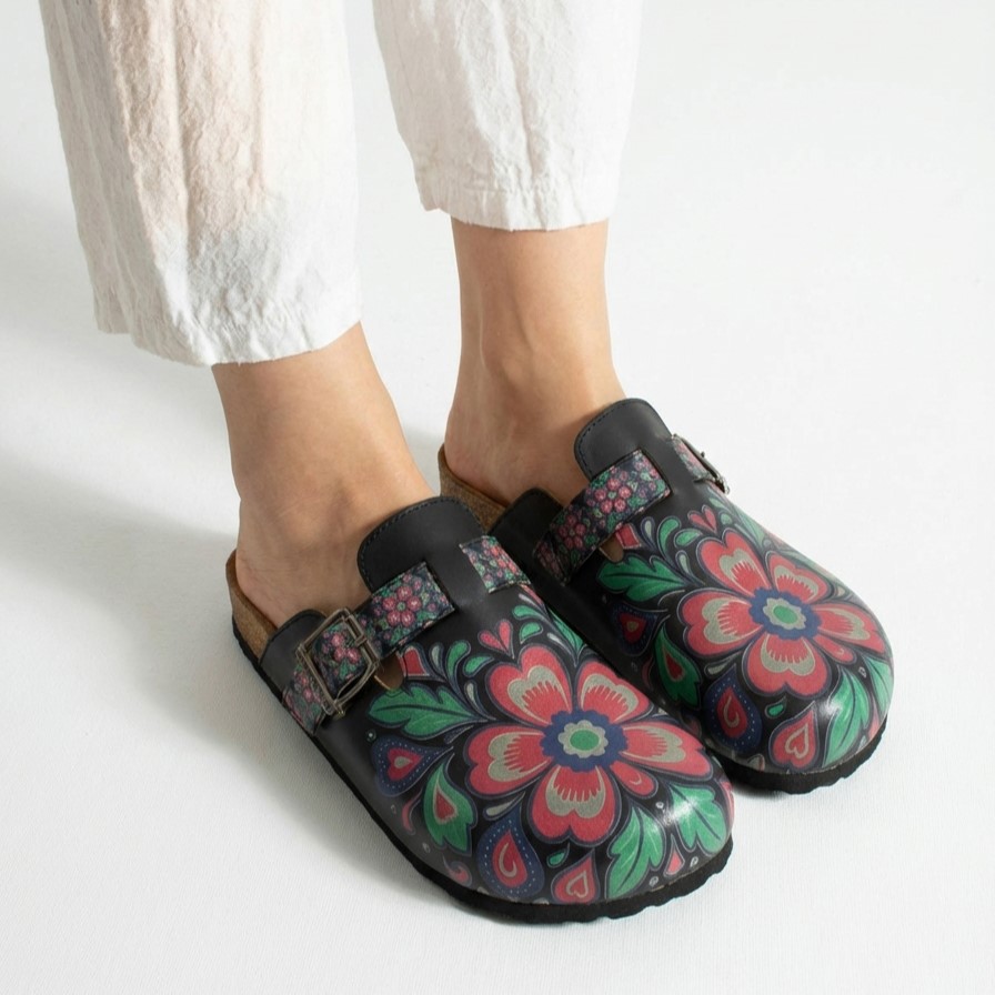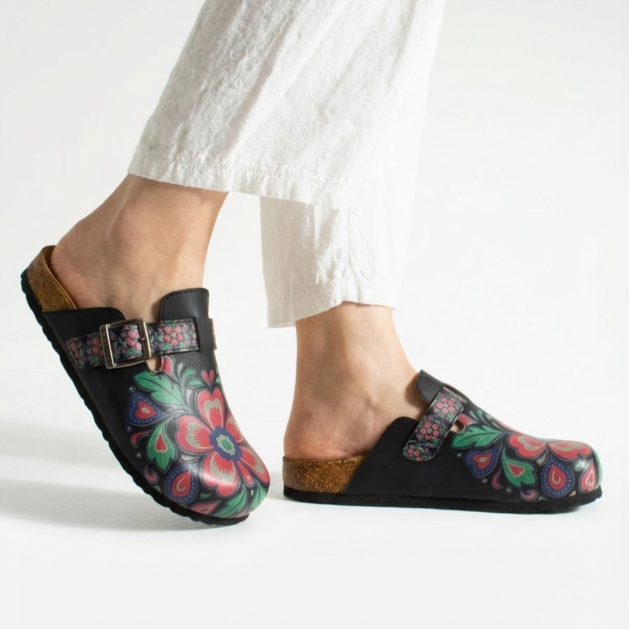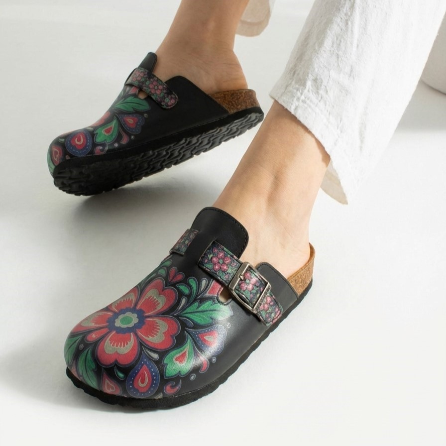 Горната част е изработена от висококачествена еко кожа в тъмен цвят с богат многоцветен флорален принт. Материалът е устойчив, лесен за поддръжка и подходящ за ежедневно носене – както у дома, така и на работа или навън. Регулируемата катарама позволява прецизно напасване към ходилото и осигурява стабилност при движение.