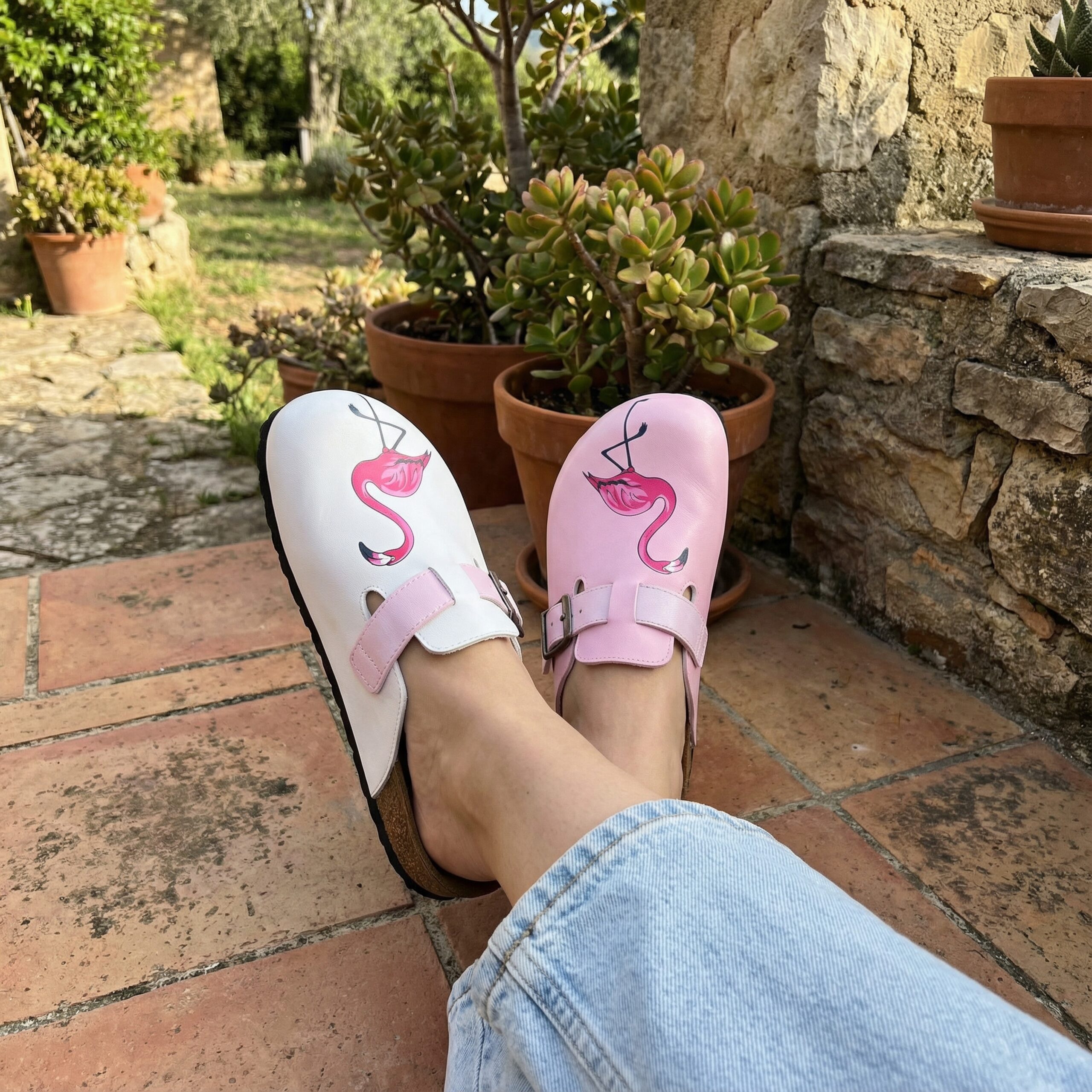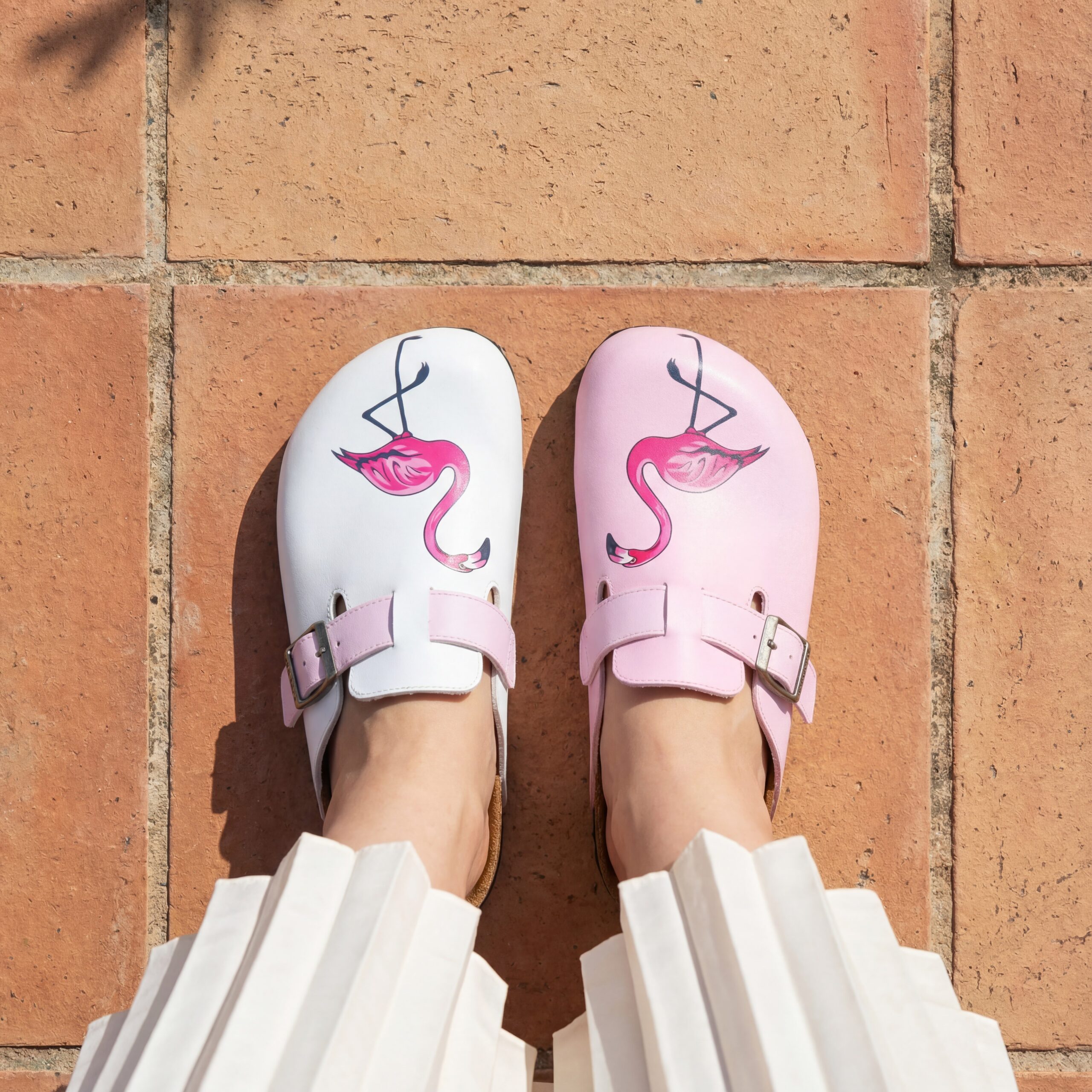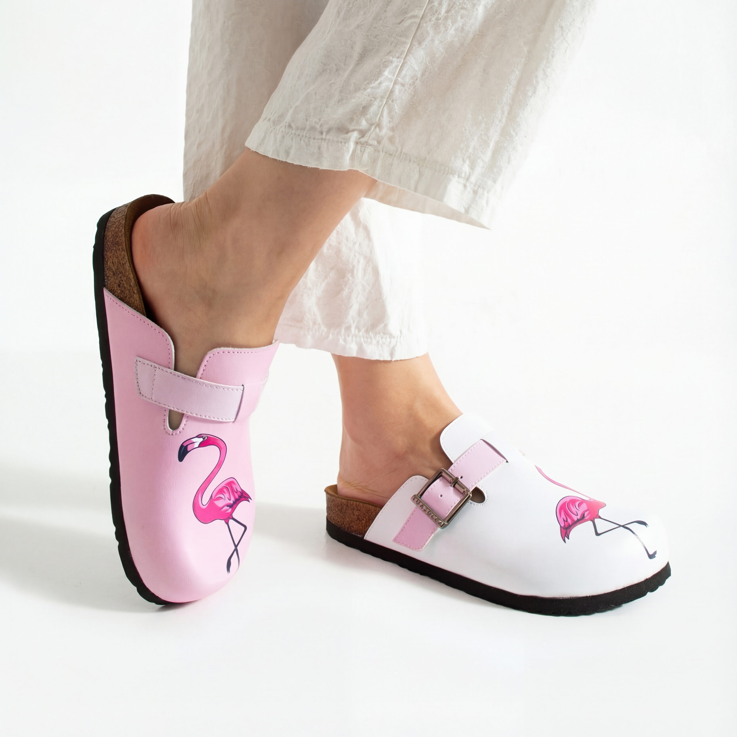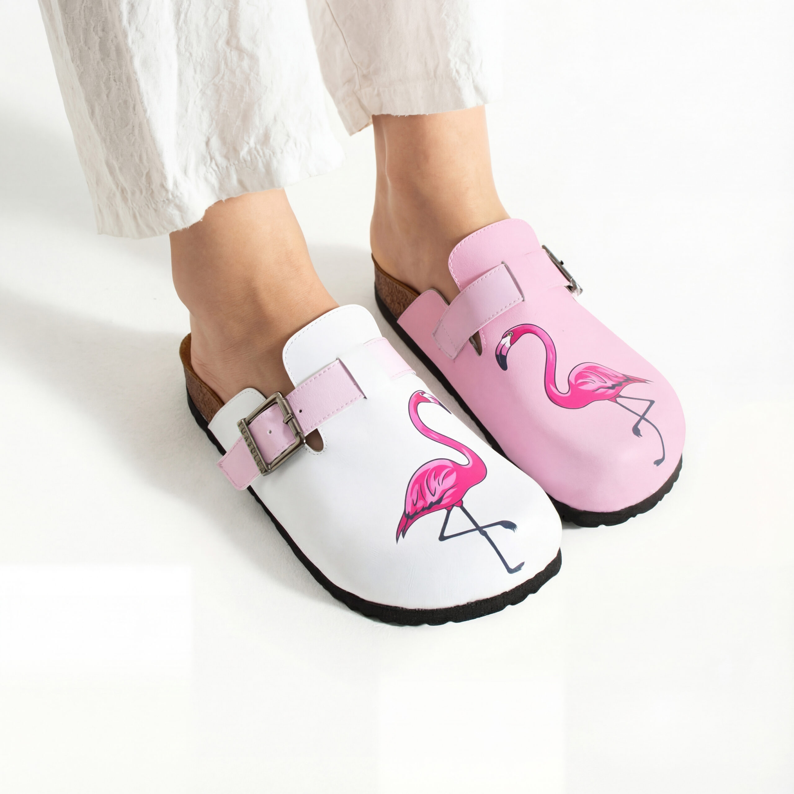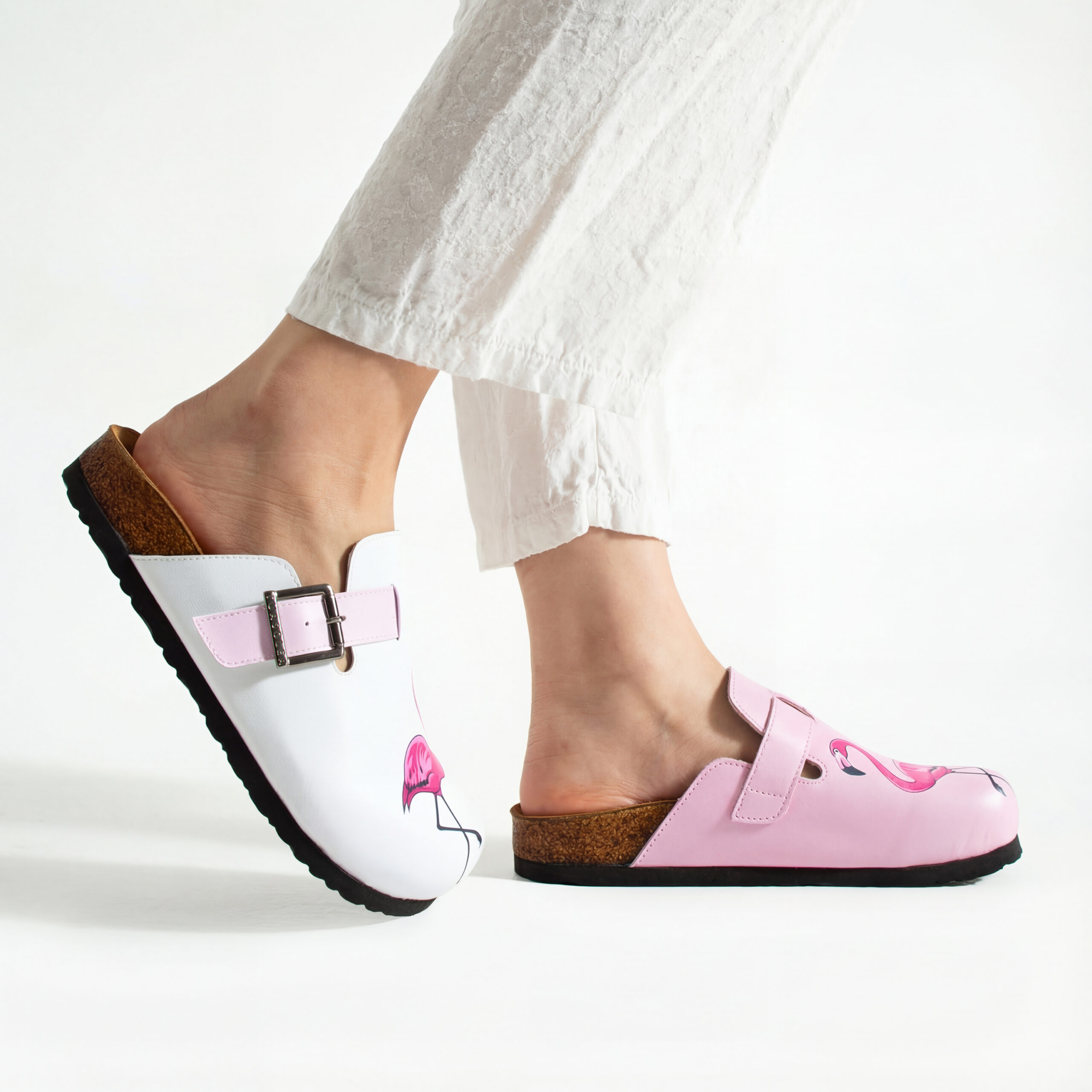 Изработени са от висококачествена еко кожа, устойчива на напукване и деформация, с дълготраен UV печат с фламинго мотив, който запазва цветовете си за дълго. Ортопедичната подметка осигурява стабилна опора и равномерно разпределение на натоварването, а стелката от микрофибър е приятна на допир, не запарва и не позволява приплъзване. Формата на сабото не притиска пръстите, металната катарама е устойчива на корозия и позволява лесно напасване към нормален и леко по-широк крак, а материалите не задържат прах, петна и неприятни миризми при ежедневна употреба.