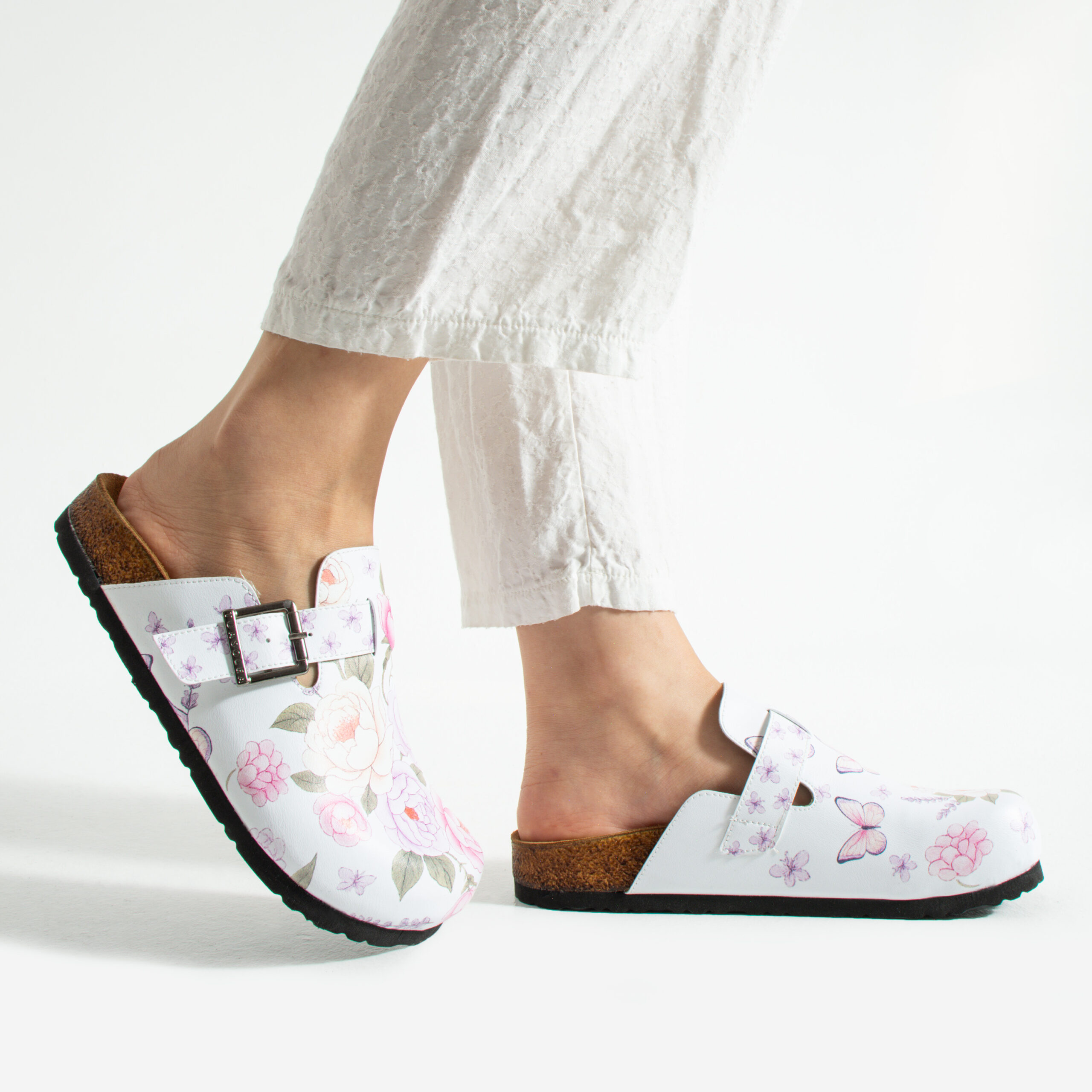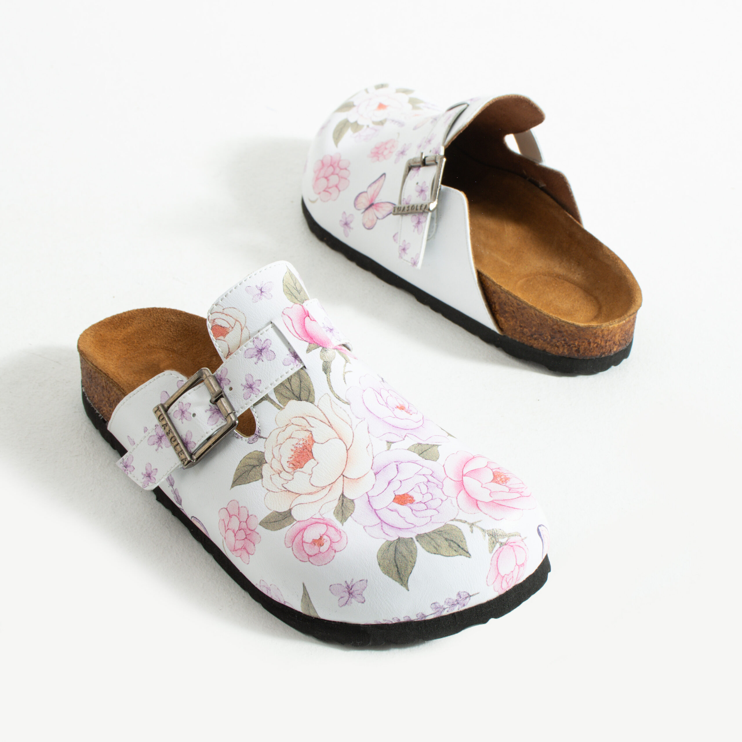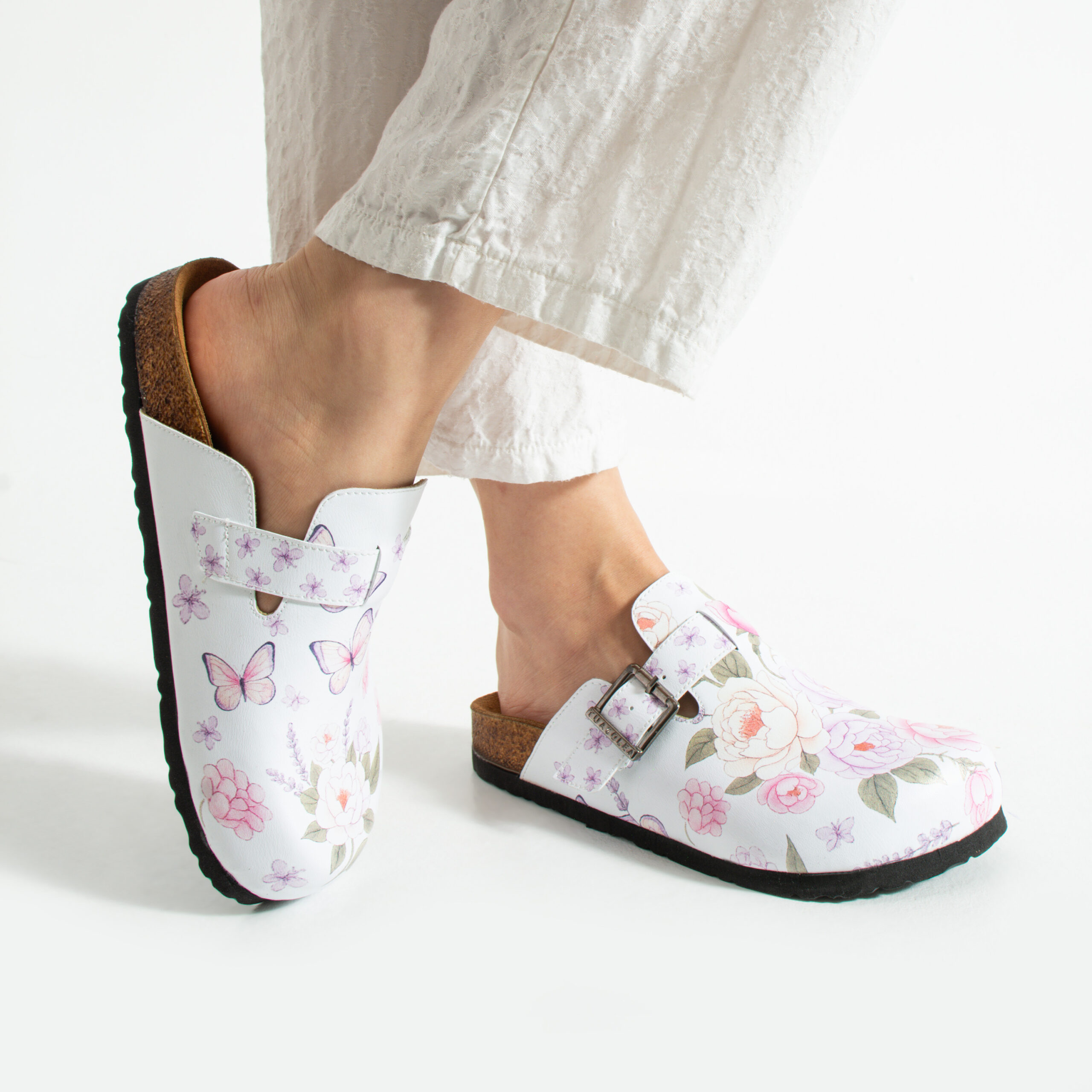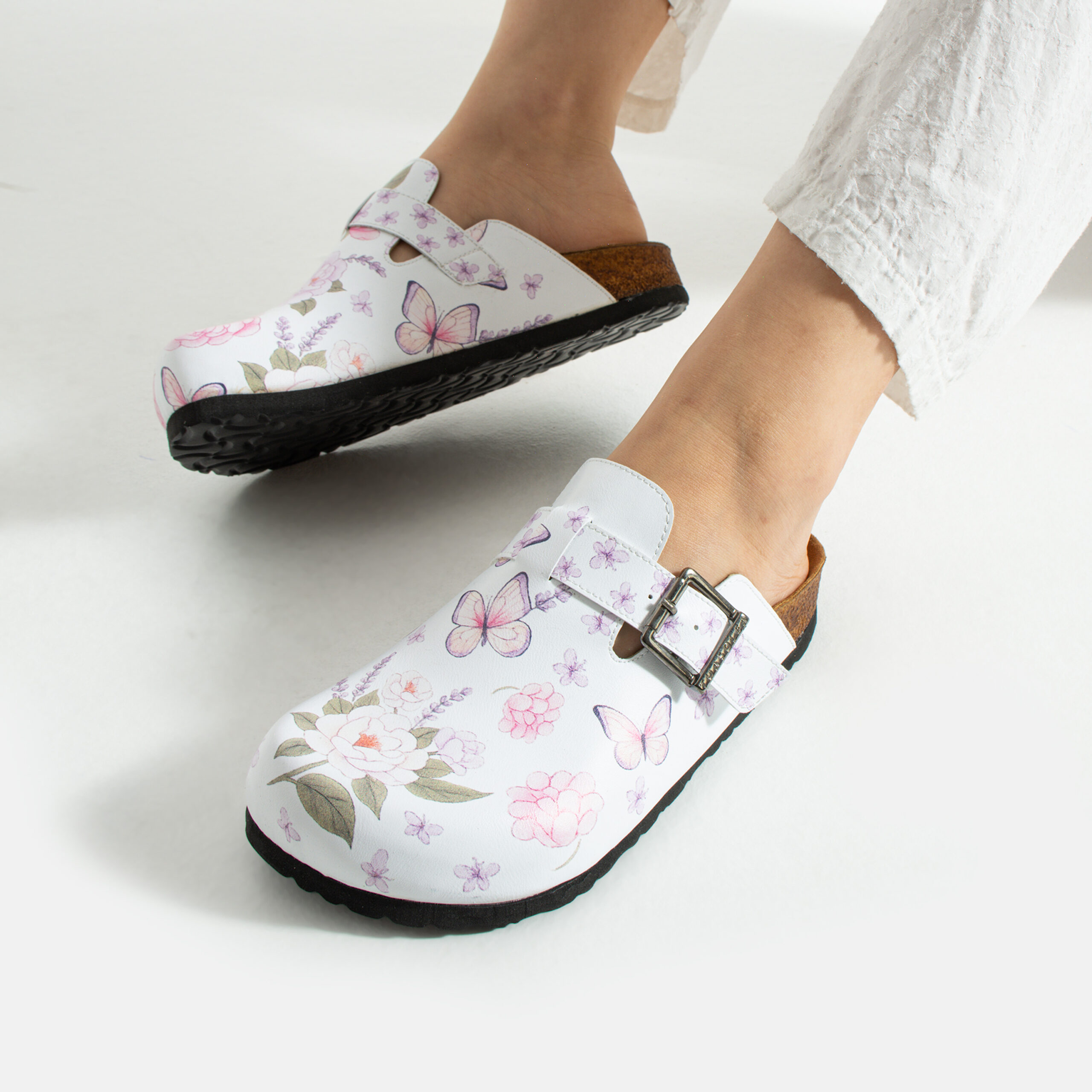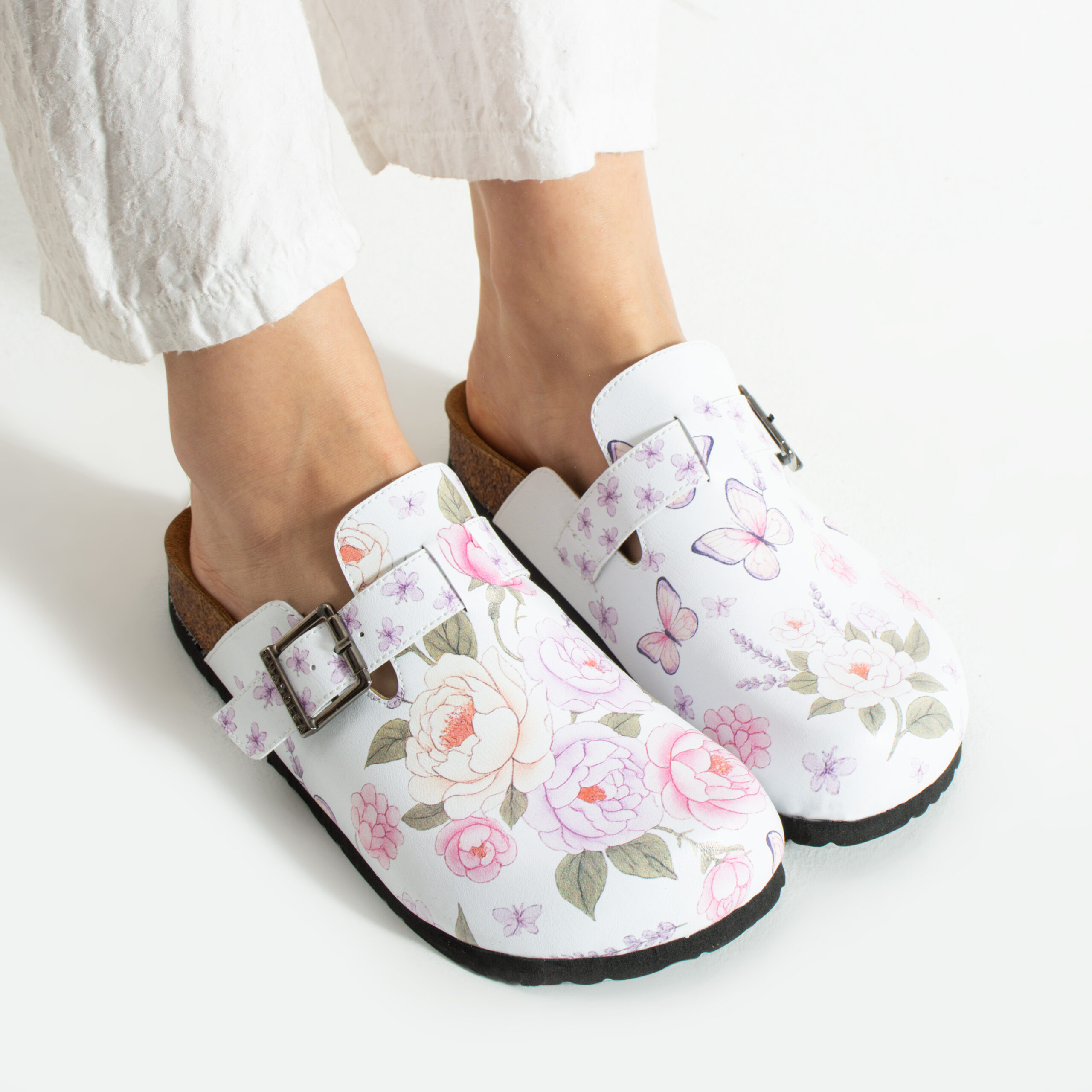 Изработени са от висококачествена еко кожа, устойчива на напукване и деформация, с нежен флорален UV печат, който запазва цветовете си за дълго и придава меко, женствено излъчване. Ортопедичната подметка осигурява стабилна опора и равномерно разпределение на натоварването при продължително носене, а стелката от микрофибър е приятна на допир, не запарва и не позволява приплъзване. Формата на сабото не притиска пръстите, металната катарама е устойчива на корозия и позволява лесно напасване към нормален и леко по-широк крак, а материалите не задържат прах, петна и неприятни миризми при ежедневна употреба.