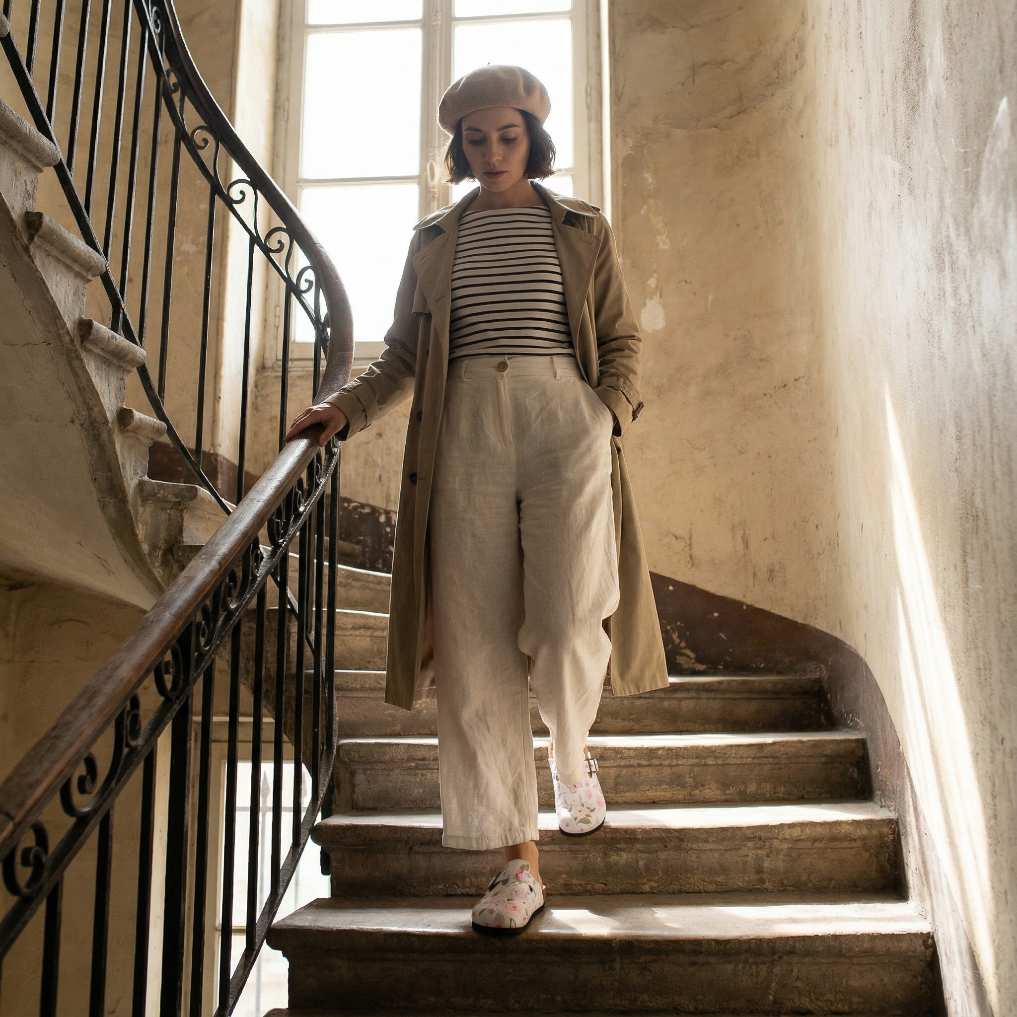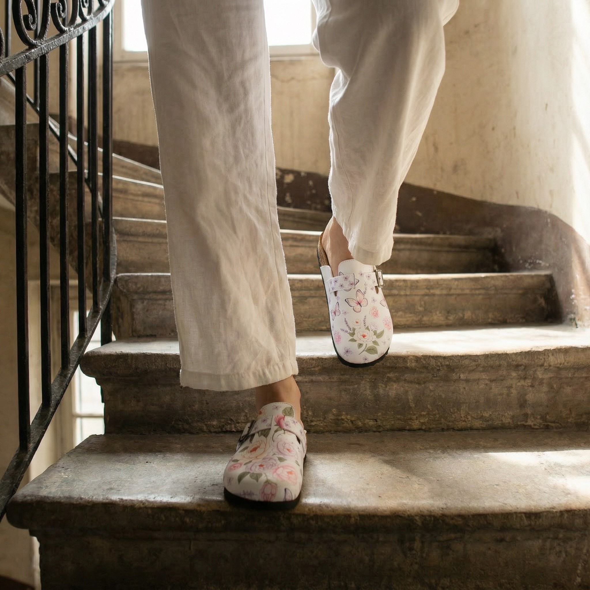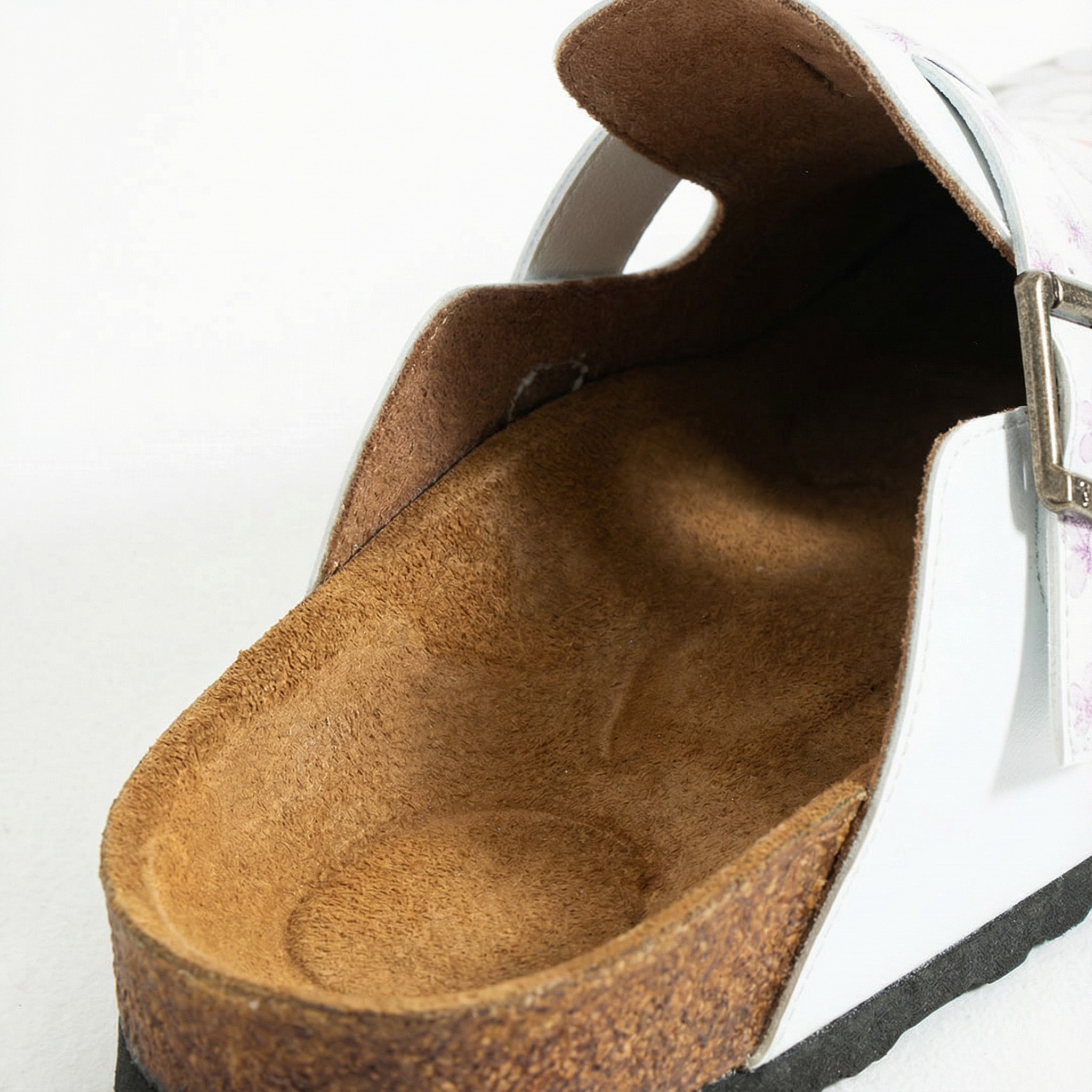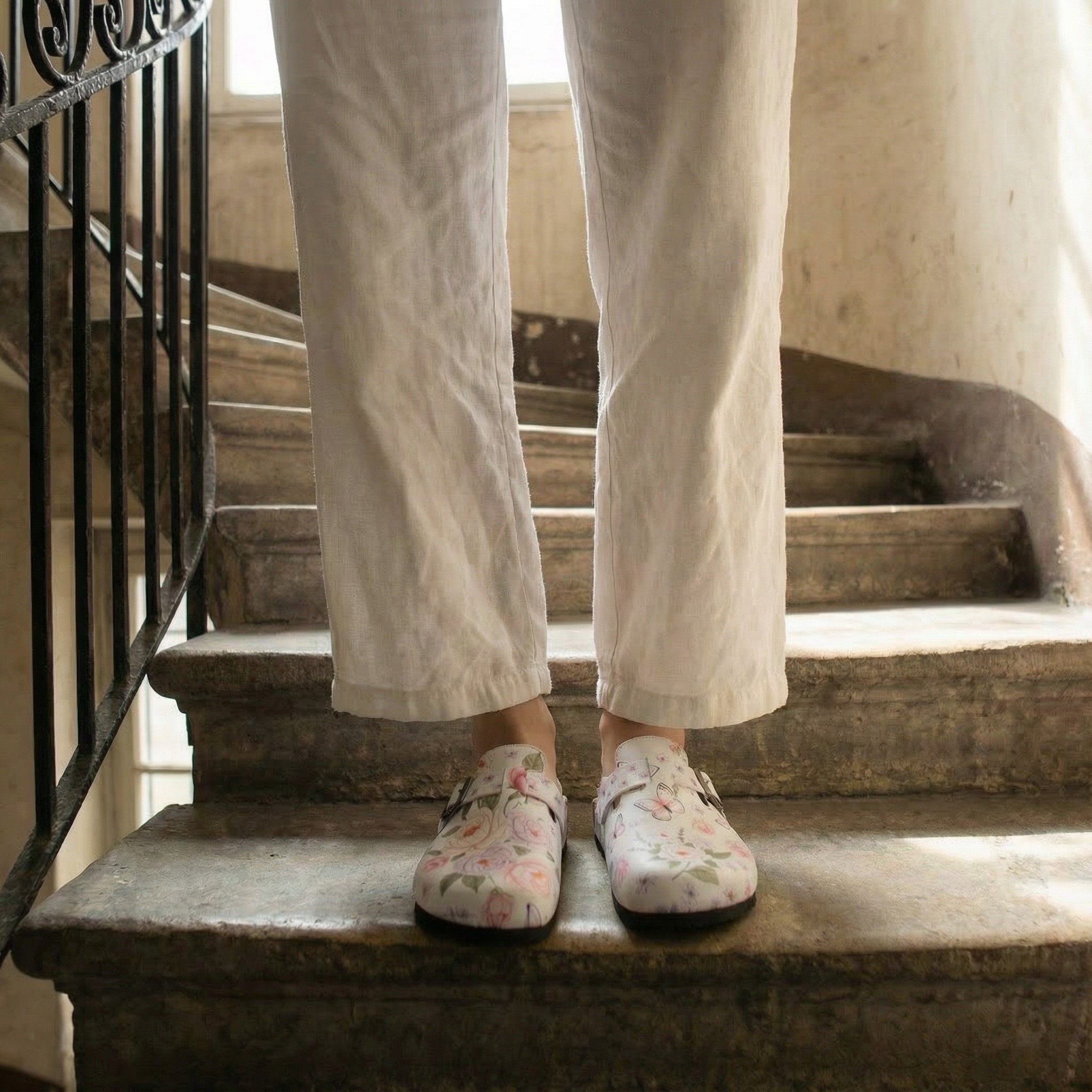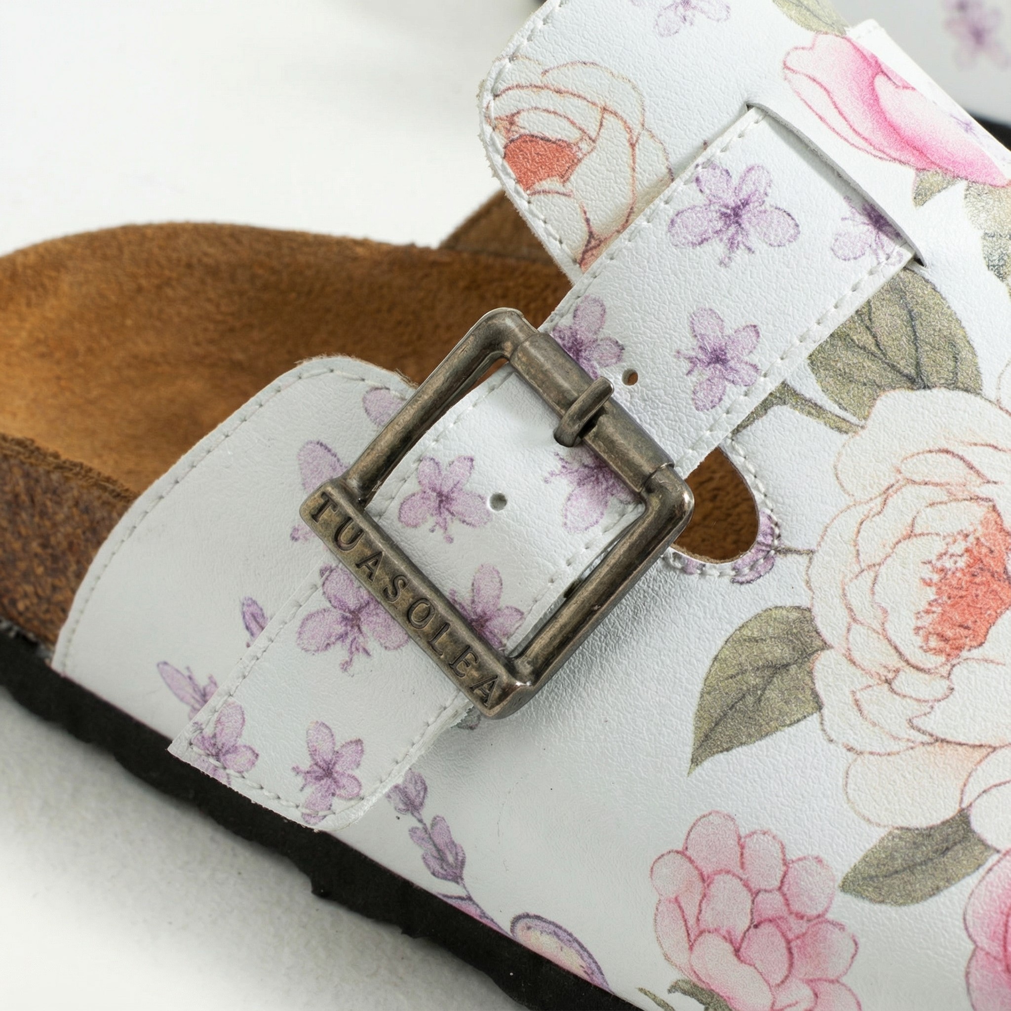Изработени са от висококачествена еко кожа, устойчива на напукване и деформация, с нежен флорален UV печат, който запазва цветовете си за дълго и придава меко, женствено излъчване. Ортопедичната подметка осигурява стабилна опора и равномерно разпределение на натоварването при продължително носене, а стелката от микрофибър е приятна на допир, не запарва и не позволява приплъзване. Формата на сабото не притиска пръстите, металната катарама е устойчива на корозия и позволява лесно напасване към нормален и леко по-широк крак, а материалите не задържат прах, петна и неприятни миризми при ежедневна употреба.