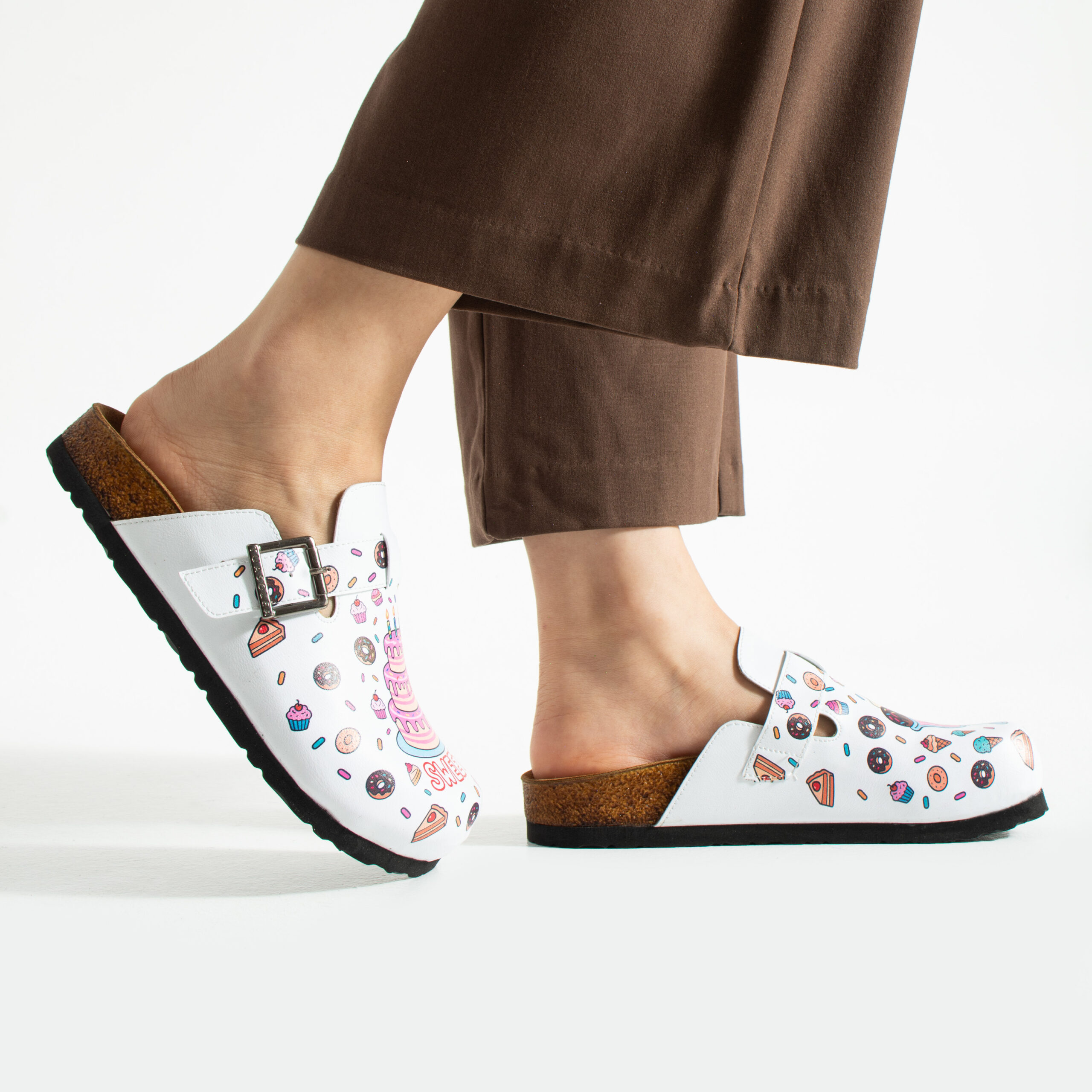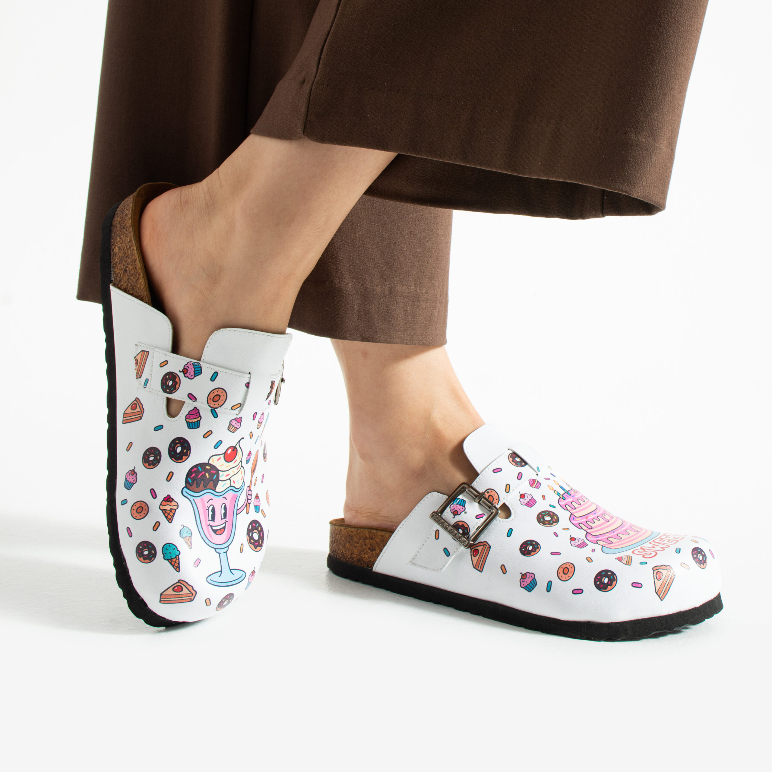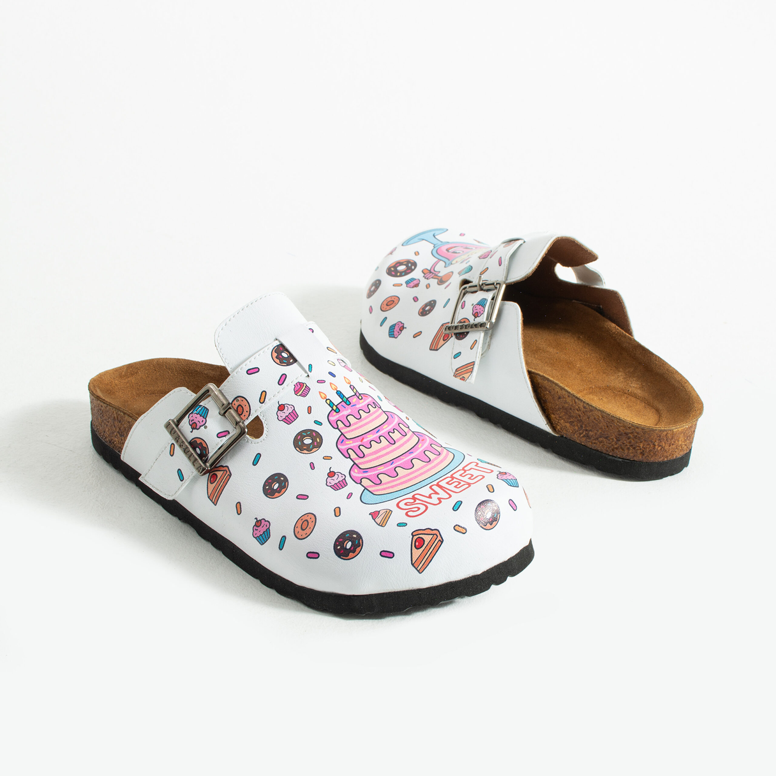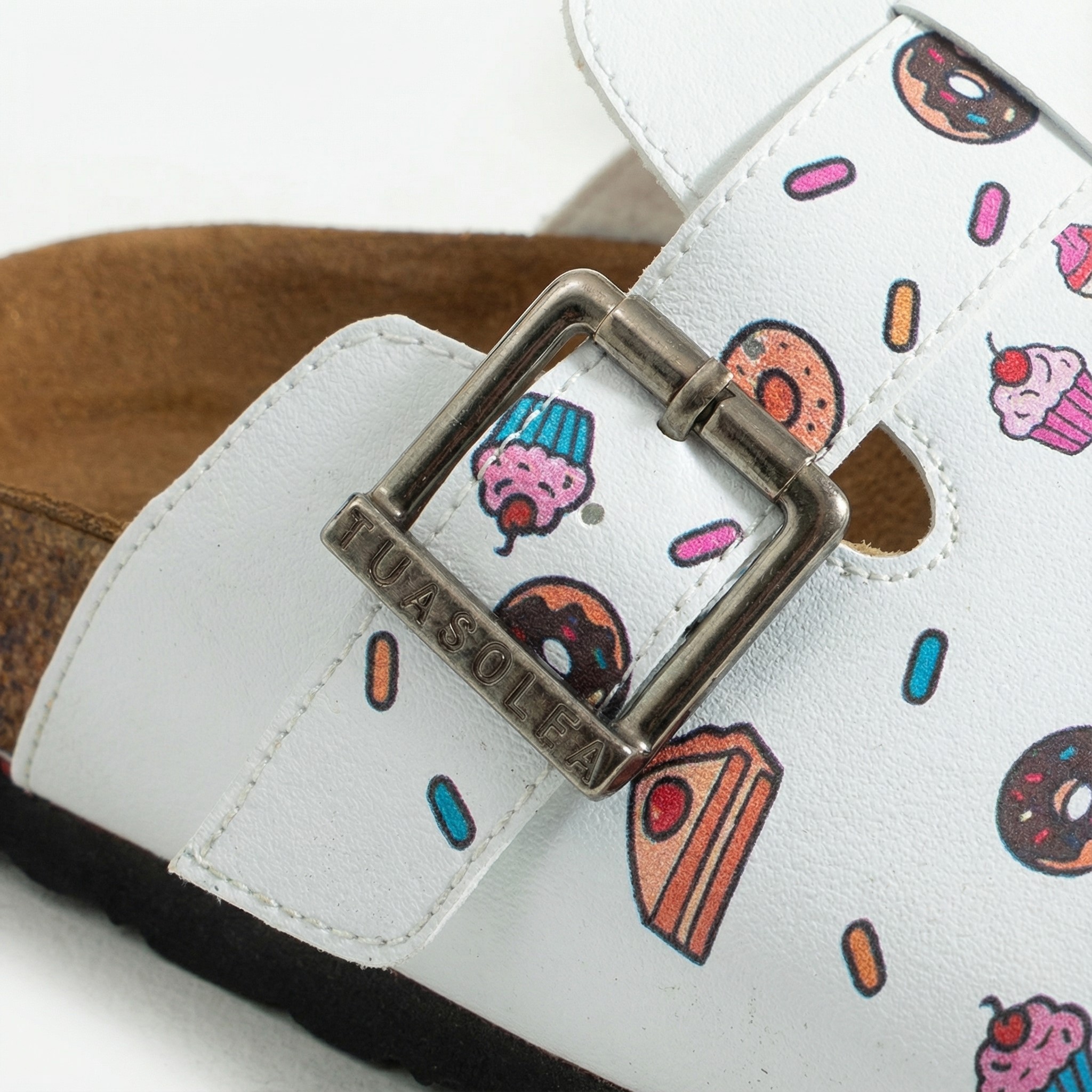 Изработени са от висококачествена еко кожа, устойчива на напукване и деформация, с дълготраен UV печат, който запазва цветовете си за дълго. Ортопедичната подметка осигурява стабилна опора и равномерно разпределение на натоварването, а стелката от микрофибър е приятна на допир, не запарва и не позволява приплъзване. Формата на сабото не притиска пръстите, металната катарама е устойчива на корозия и позволява лесно напасване към нормален и леко по-широк крак, а материалите не задържат прах, петна и неприятни миризми.