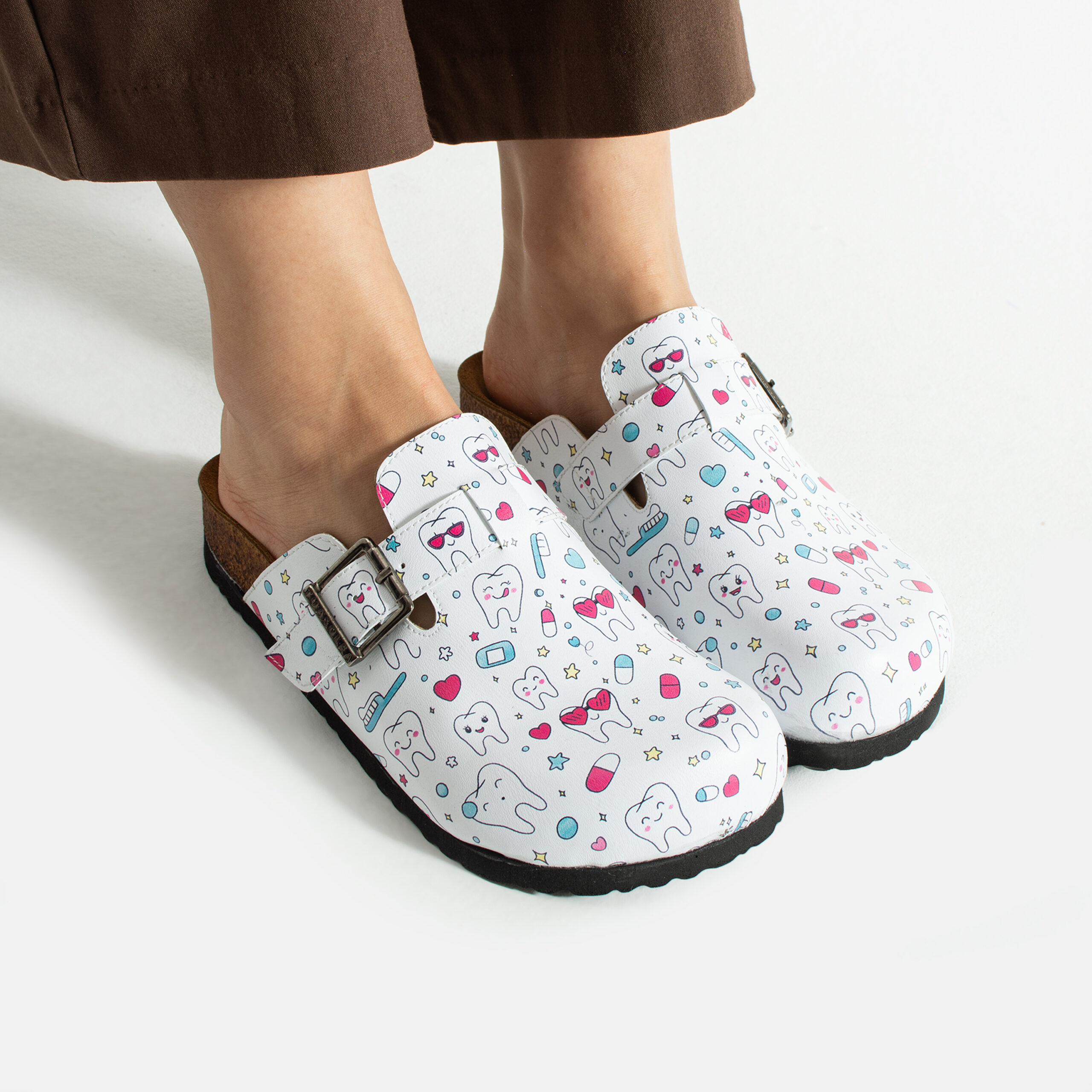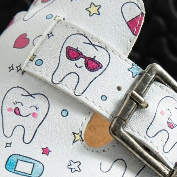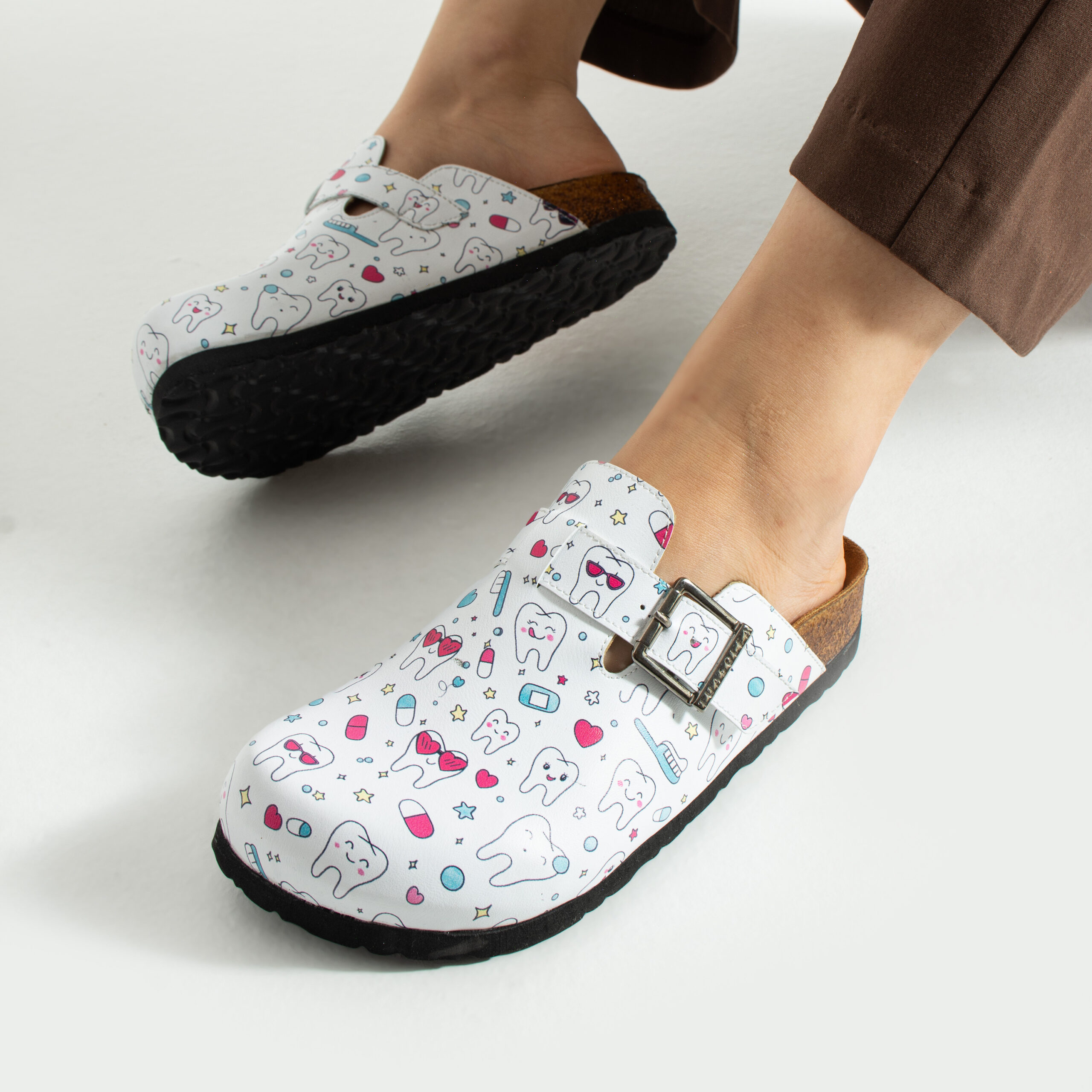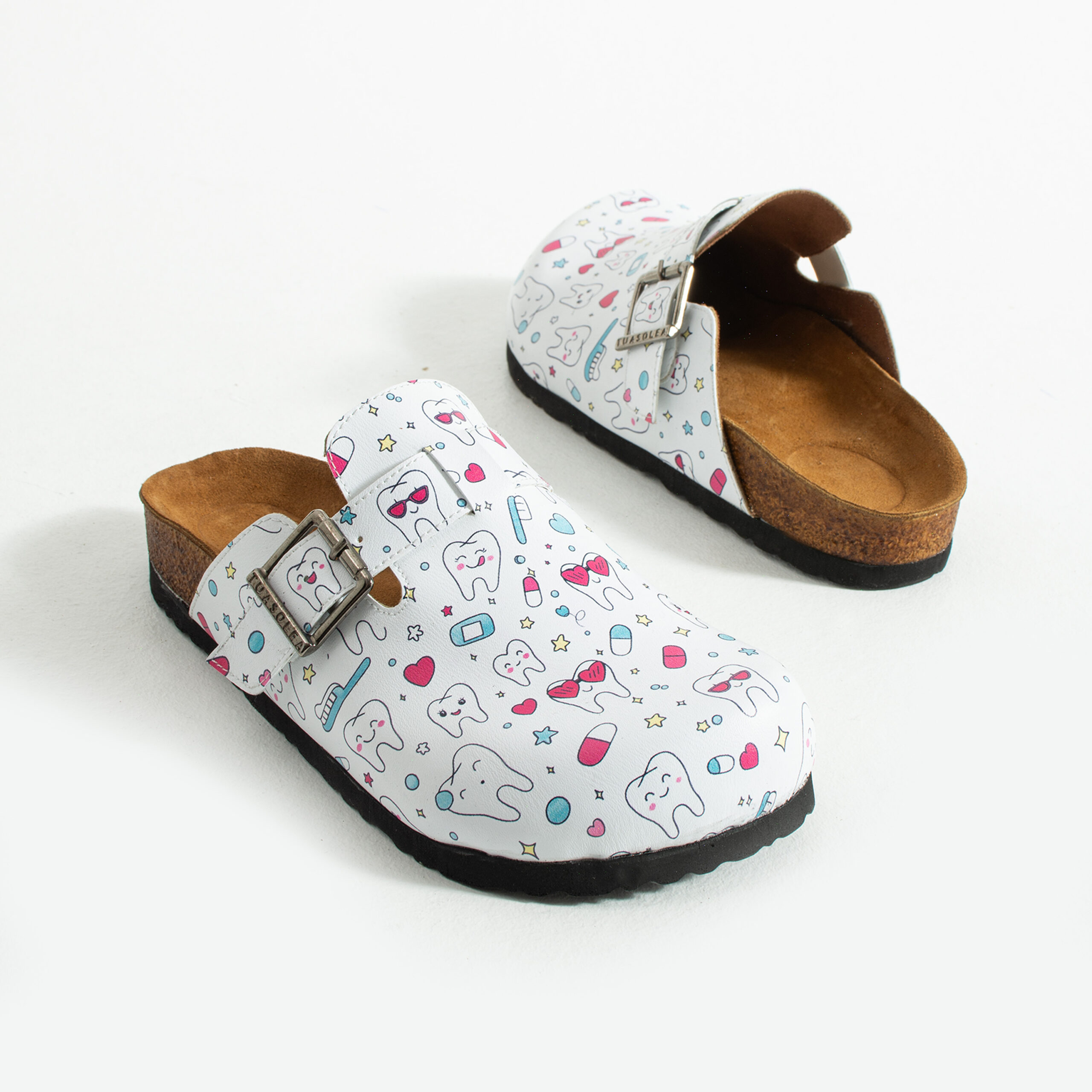 Изработени са от висококачествена еко кожа, устойчива на напукване и деформация, с дълготраен UV печат с дентални мотиви, който запазва цветовете си за дълго. Ортопедичната подметка осигурява стабилна опора и равномерно разпределение на натоварването, а стелката от микрофибър е приятна на допир, не запарва и не позволява приплъзване по време на работа. Формата на сабото не притиска пръстите, металната катарама е устойчива на корозия и позволява лесно напасване към нормален и леко по-широк крак, а материалите не задържат прах, петна и неприятни миризми при ежедневна професионална употреба.