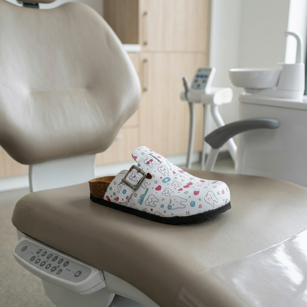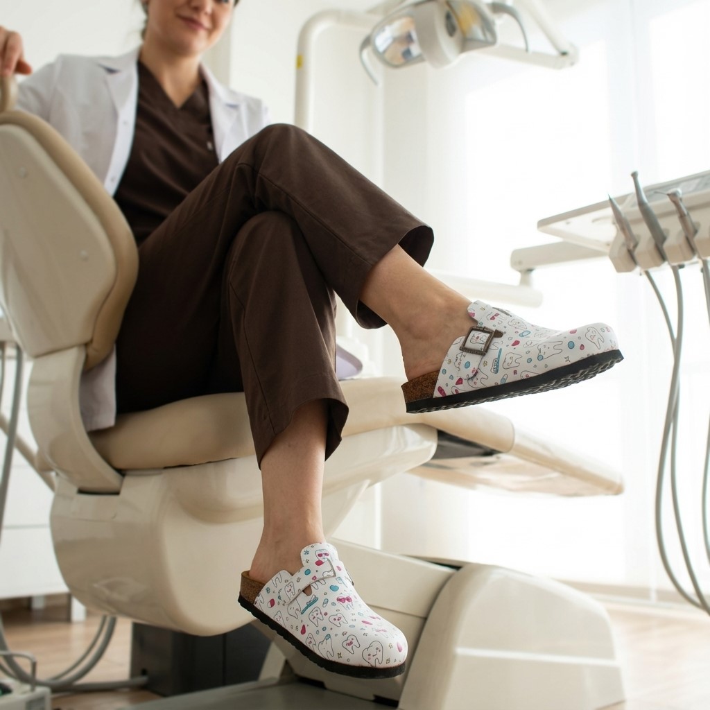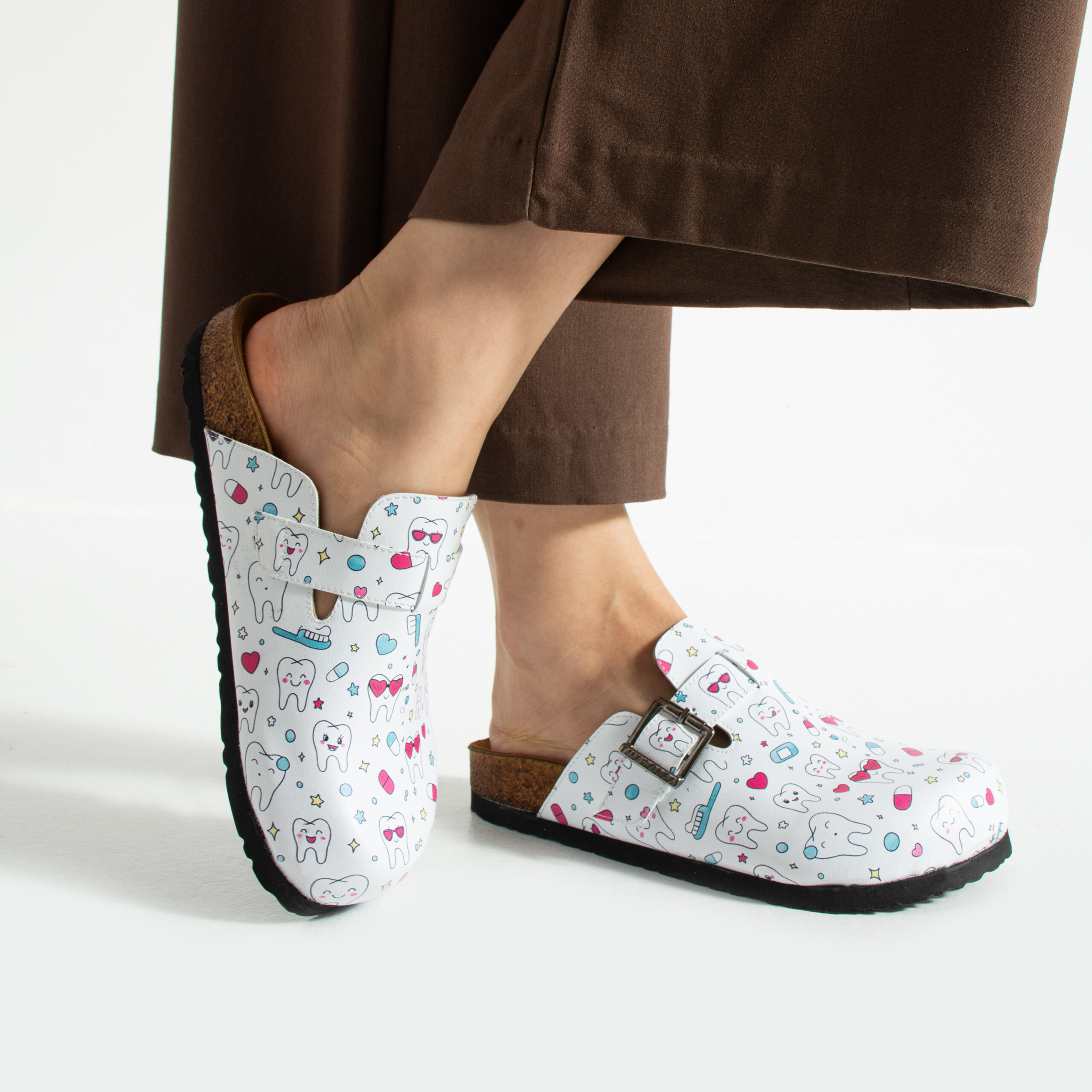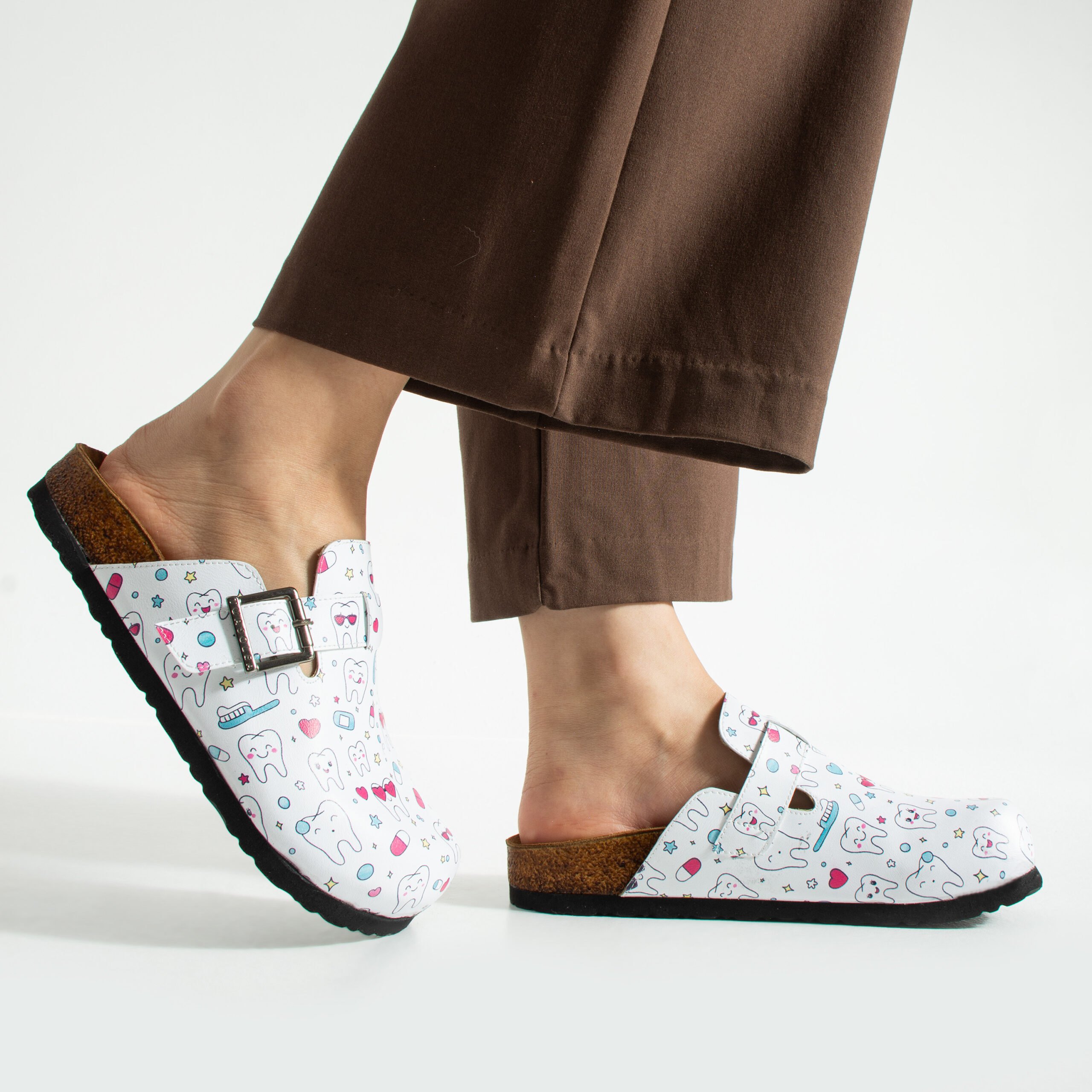 Изработени са от висококачествена еко кожа, устойчива на напукване и деформация, с дълготраен UV печат с дентални мотиви, който запазва цветовете си за дълго. Ортопедичната подметка осигурява стабилна опора и равномерно разпределение на натоварването, а стелката от микрофибър е приятна на допир, не запарва и не позволява приплъзване по време на работа. Формата на сабото не притиска пръстите, металната катарама е устойчива на корозия и позволява лесно напасване към нормален и леко по-широк крак, а материалите не задържат прах, петна и неприятни миризми при ежедневна професионална употреба.