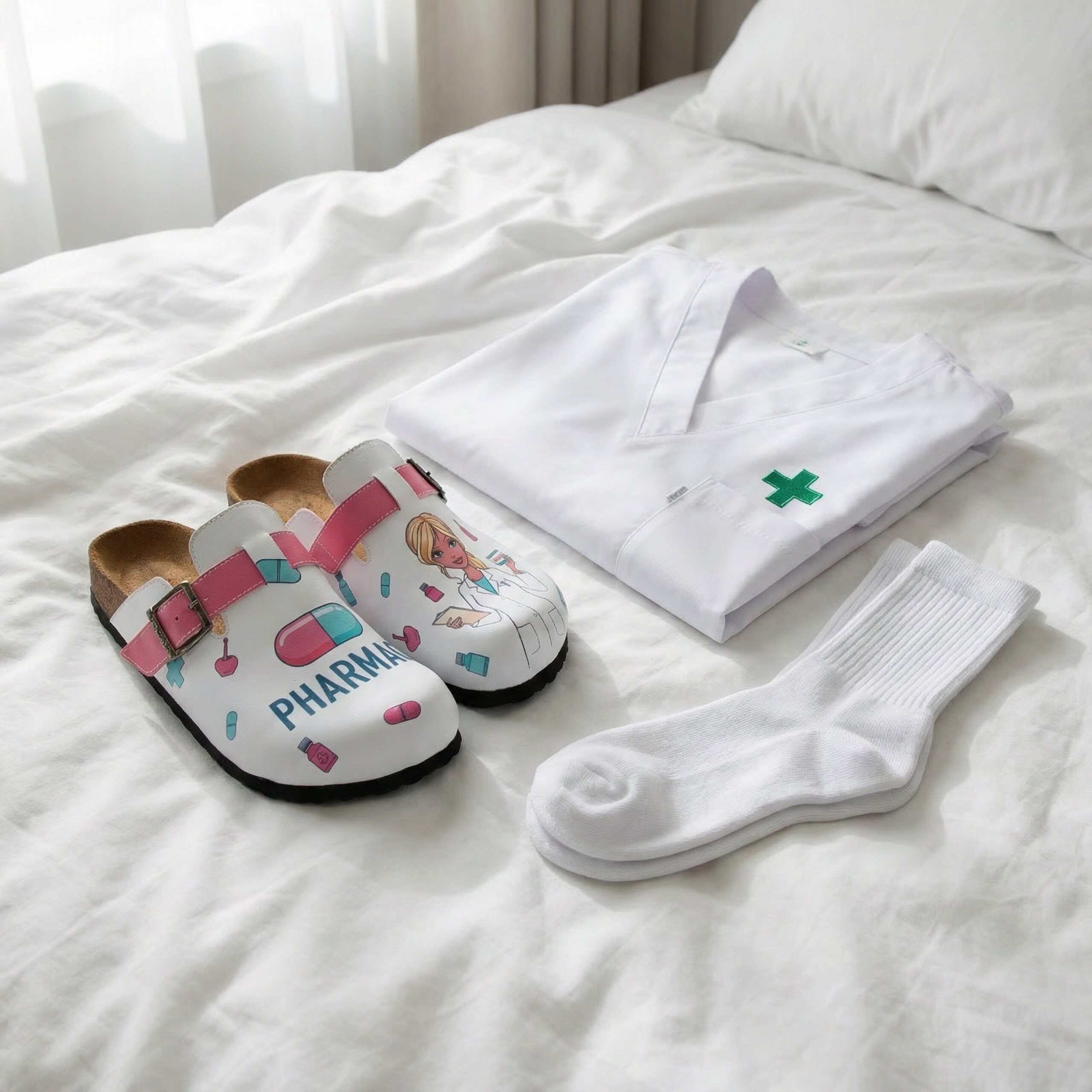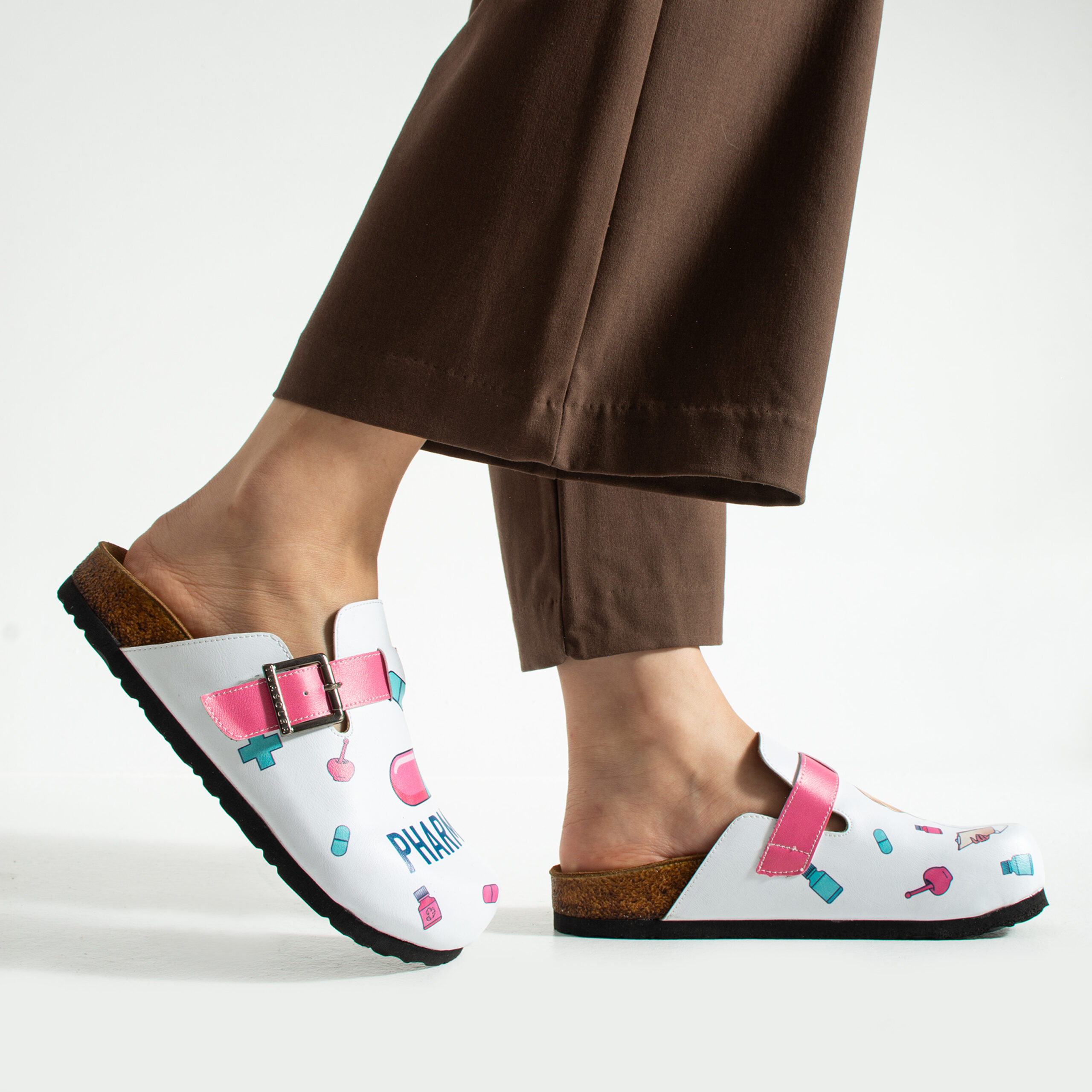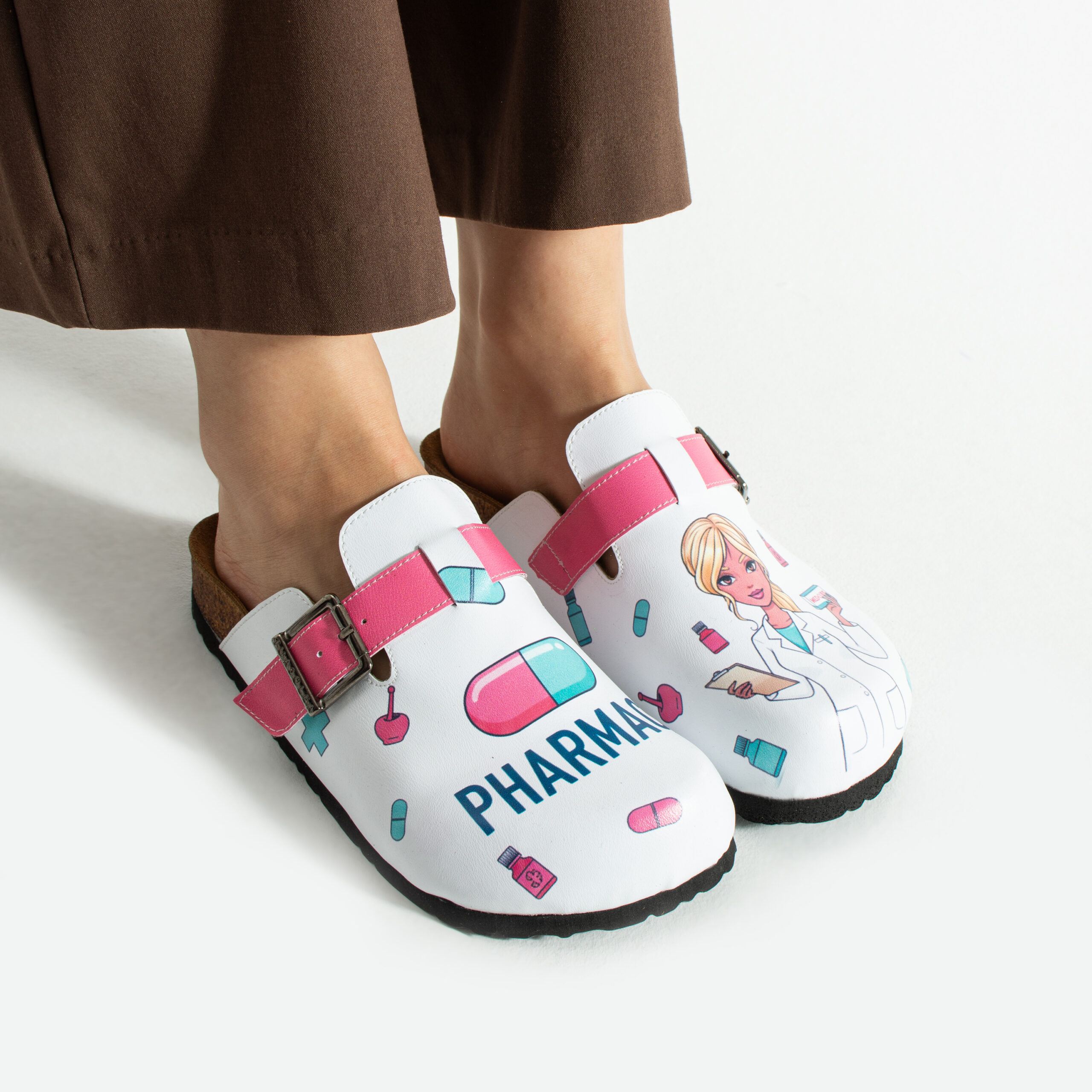 Чехлите са изработени от висококачествена еко кожа, устойчива на напукване и деформация, с дълготраен UV печат с фармацевтични мотиви, който запазва цветовете си при ежедневна употреба. Ортопедичната подметка осигурява стабилност и равномерно разпределение на натоварването при продължително стоене зад щанда или движение в работната среда, а стелката от микрофибър е мека, не запарва и предотвратява приплъзване.