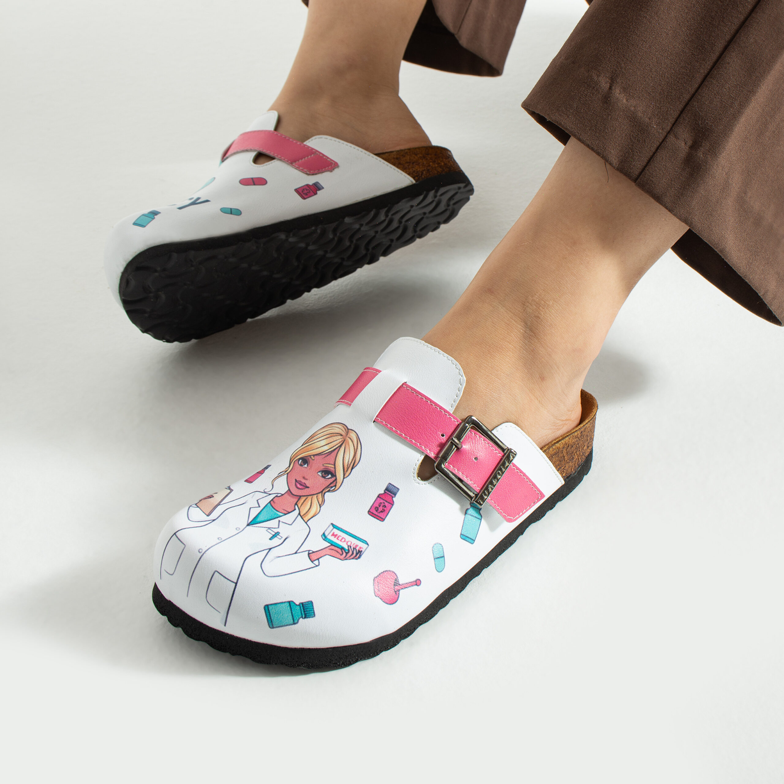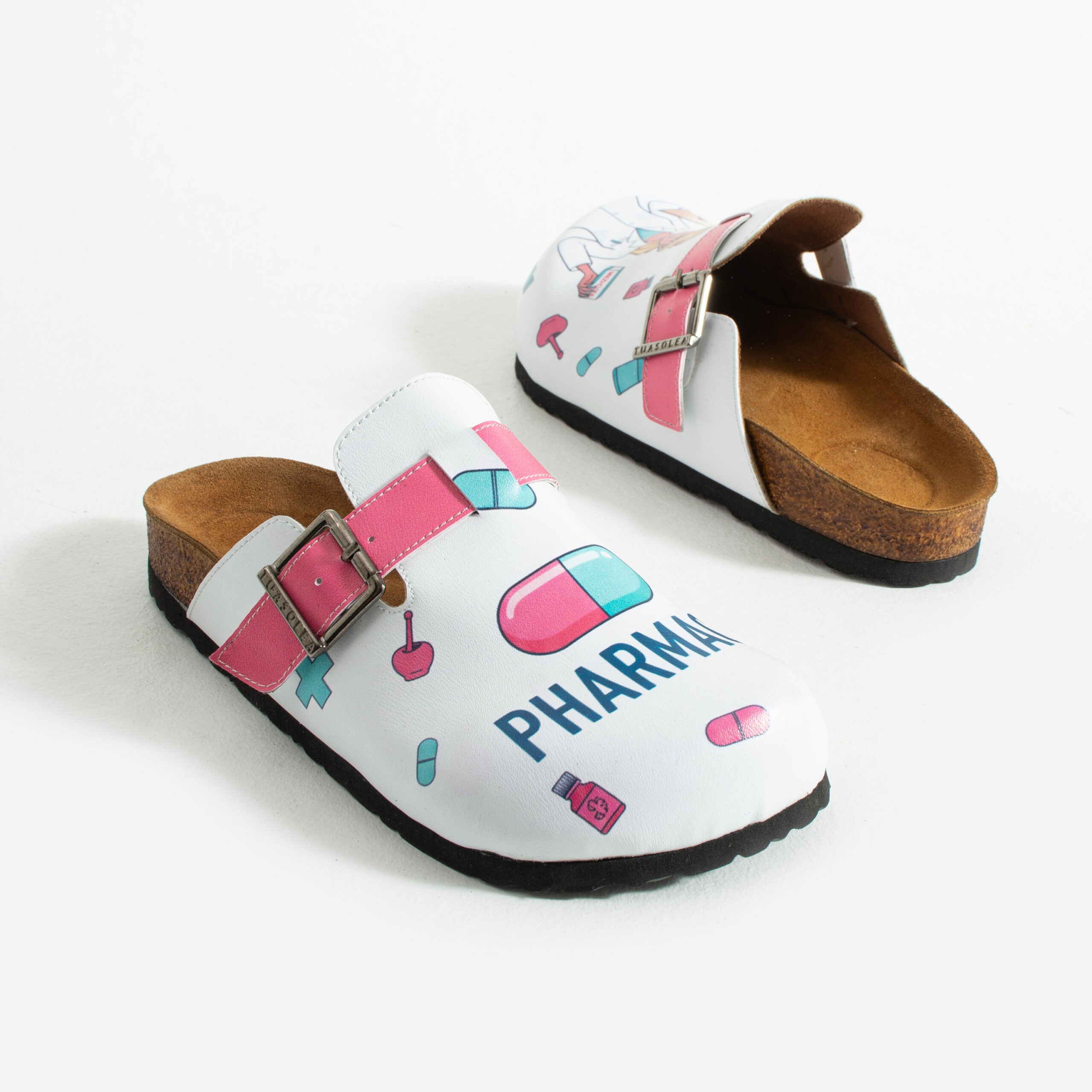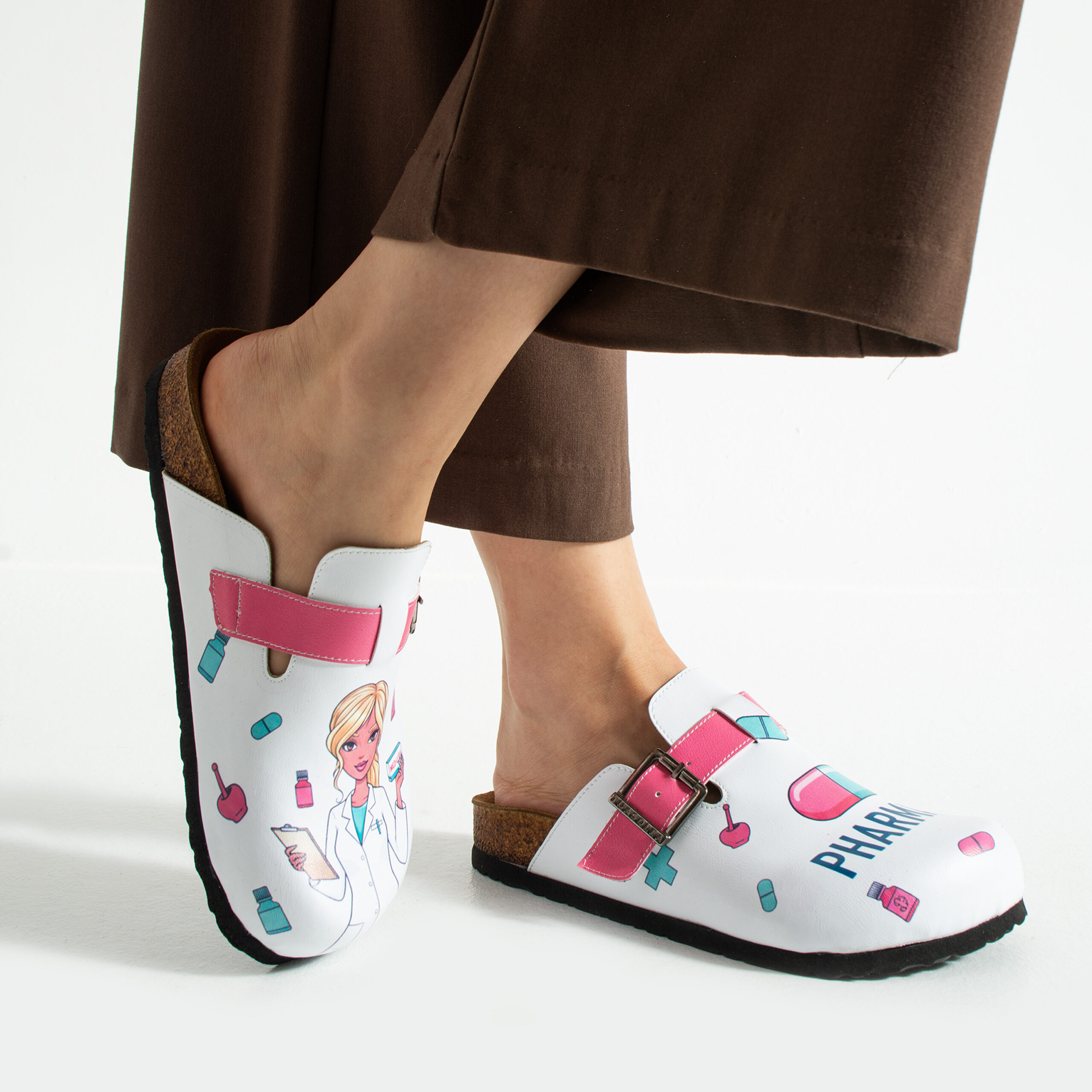 Чехлите са изработени от висококачествена еко кожа, устойчива на напукване и деформация, с дълготраен UV печат с фармацевтични мотиви, който запазва цветовете си при ежедневна употреба. Ортопедичната подметка осигурява стабилност и равномерно разпределение на натоварването при продължително стоене зад щанда или движение в работната среда, а стелката от микрофибър е мека, не запарва и предотвратява приплъзване.