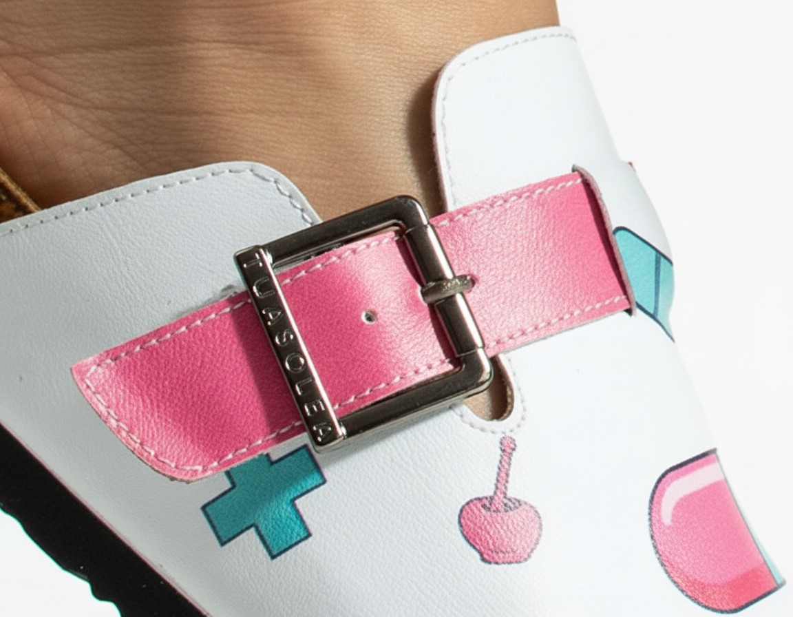Формата на сабото не притиска пръстите и допринася за комфорт през целия работен ден. Регулируемата метална катарама е устойчива на корозия и позволява лесно напасване към нормален и леко по-широк крак. Материалите не задържат прах, петна и неприятни миризми, което прави модела практичен, хигиеничен и подходящ за интензивна професионална употреба в аптечна среда.