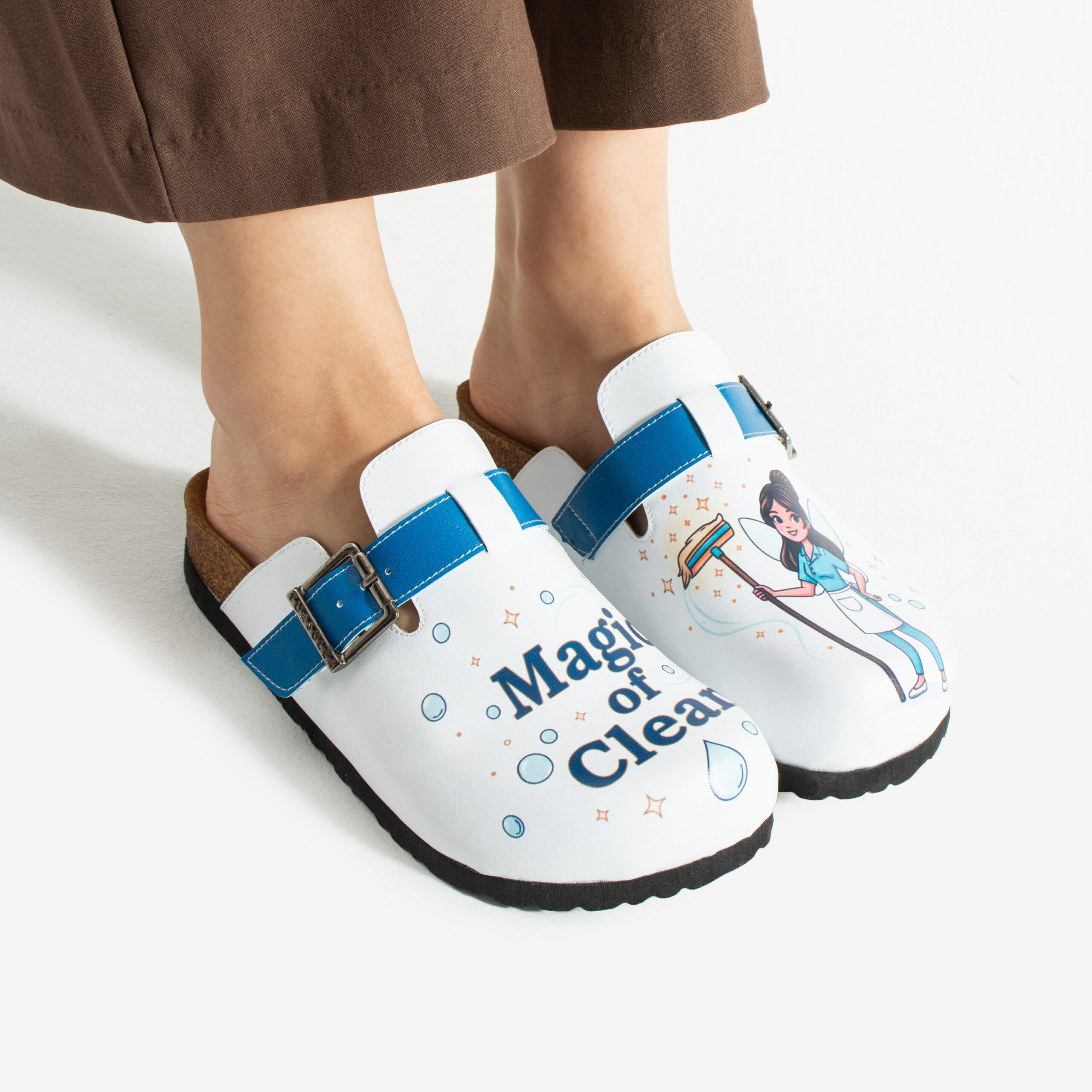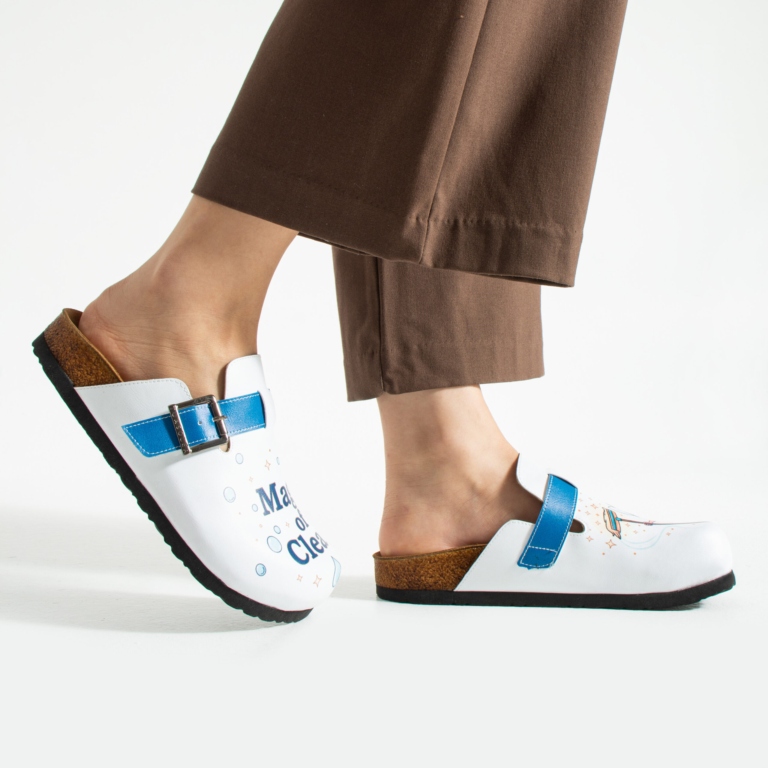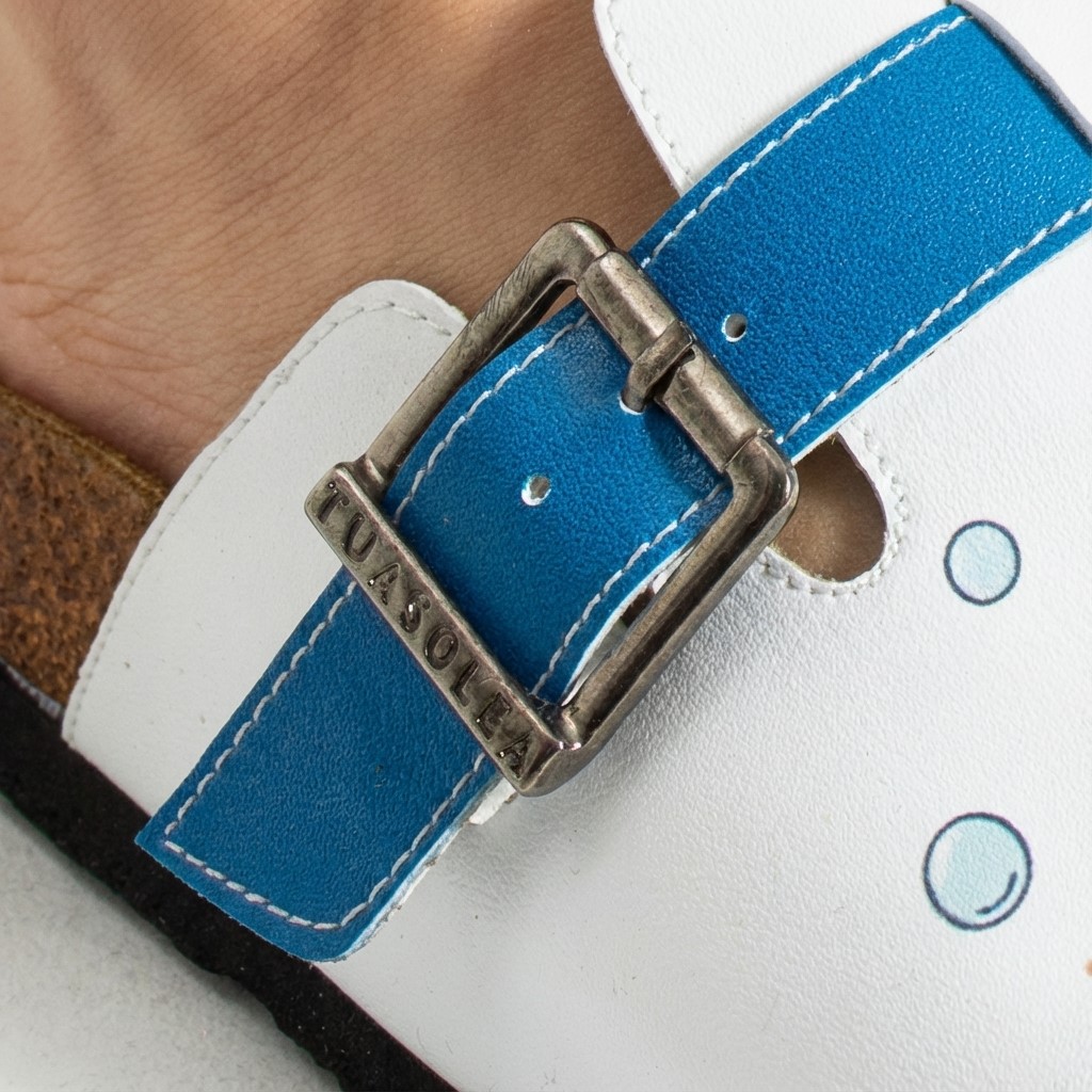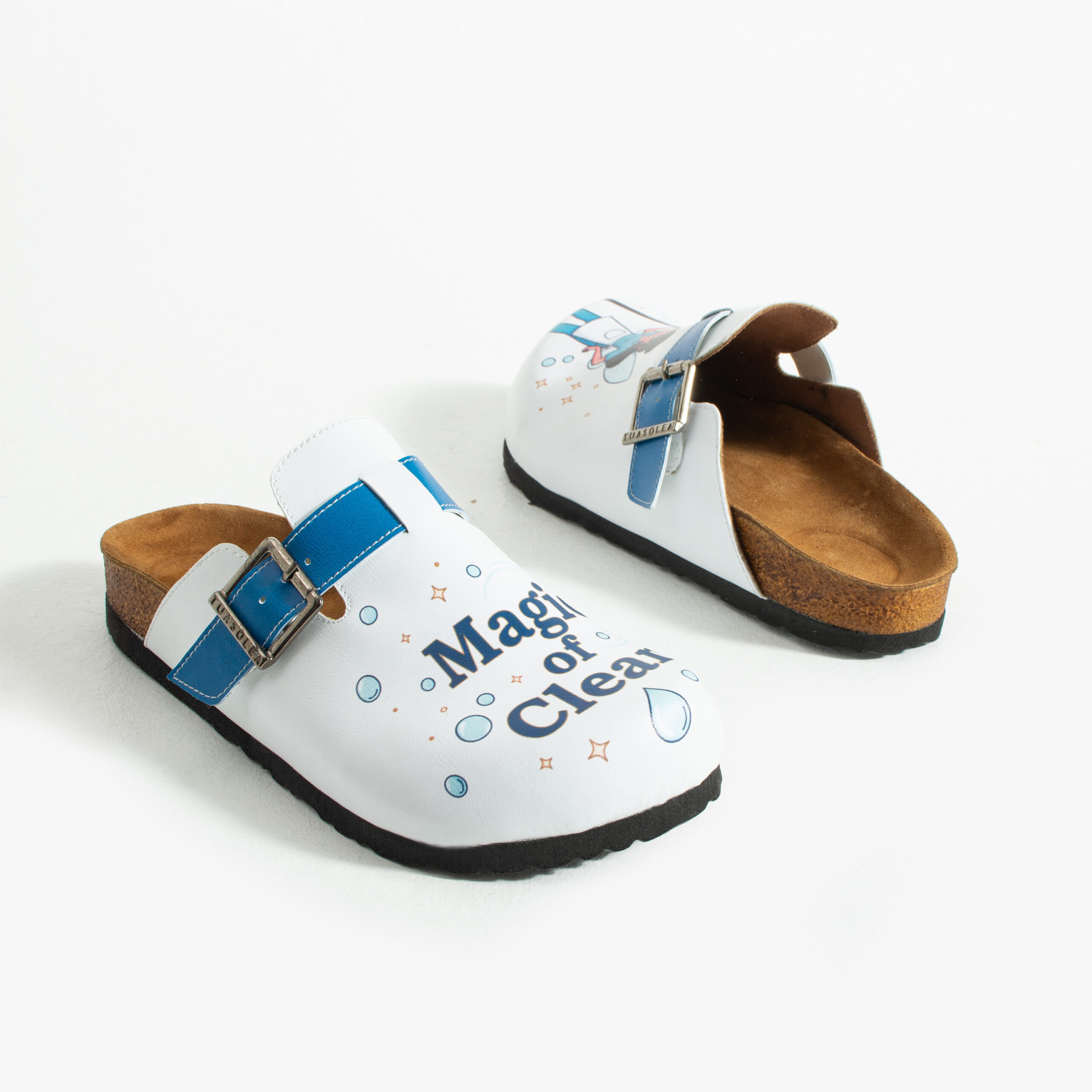 Чехлите са изработени от висококачествена еко кожа, устойчива на напукване и деформация, с дълготраен UV печат, който запазва цветовете си за дълго при редовна употреба. Ортопедичната подметка осигурява стабилна опора и равномерно разпределение на натоварването, а стелката от микрофибър е приятна на допир, не запарва и предотвратява приплъзване. Формата не притиска пръстите, металната катарама е устойчива на корозия и позволява лесно напасване към нормален и леко по-широк крак, а материалите не задържат прах, петна и неприятни миризми.