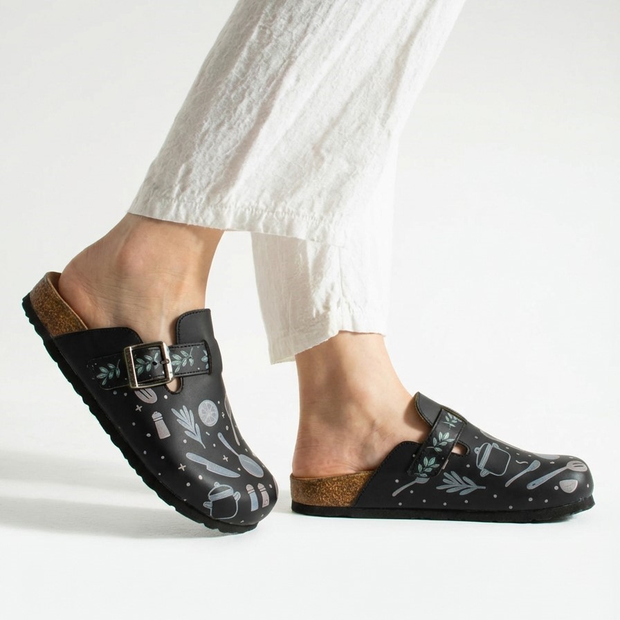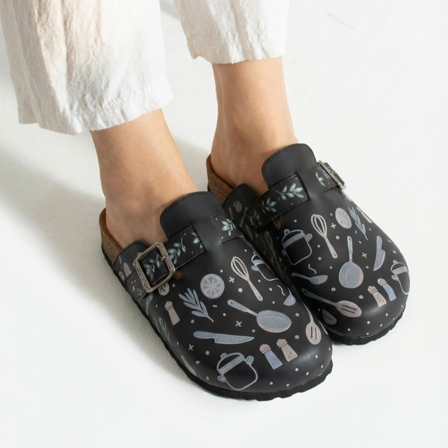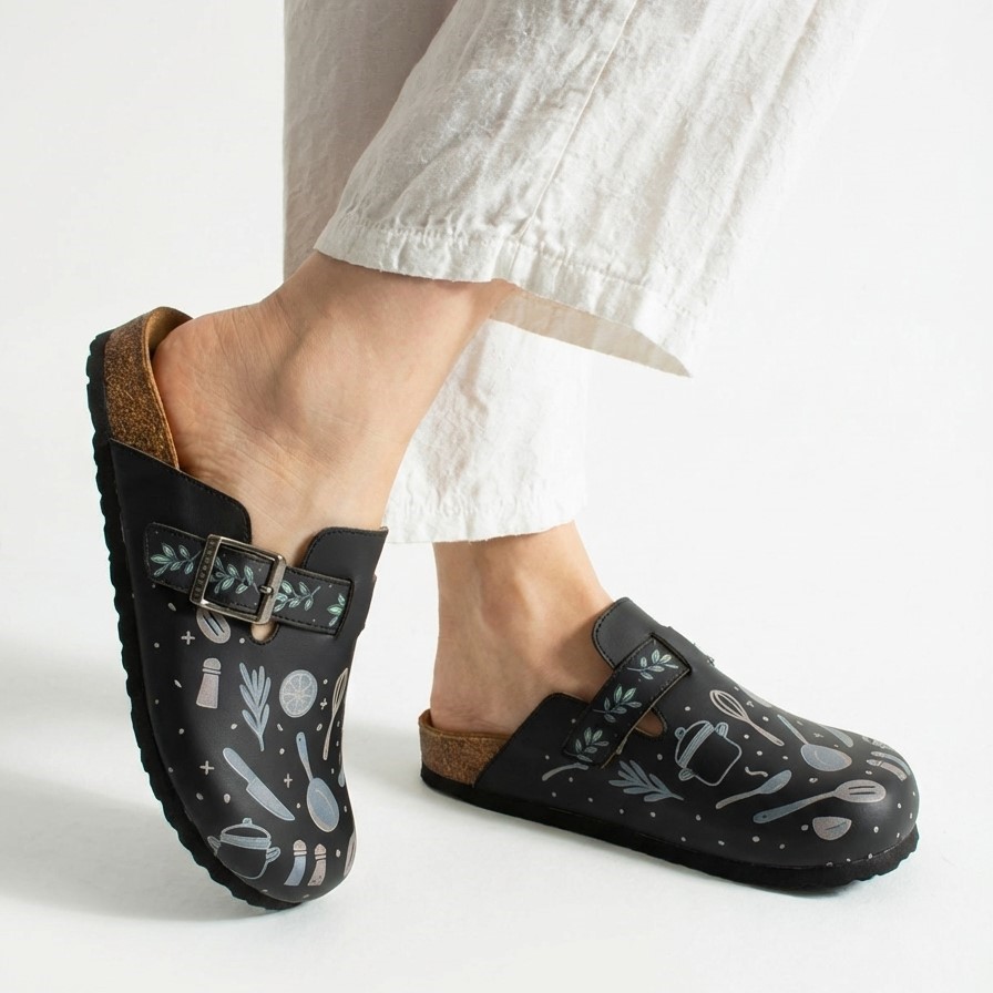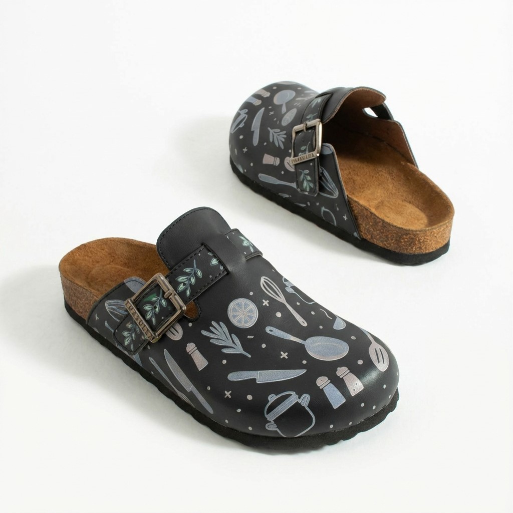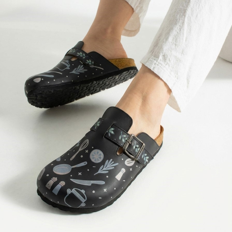 Изработени са от висококачествена еко кожа в черен цвят с дискретен кулинарен принт, който придава модерен и професионален вид. Материалът е устойчив на ежедневно натоварване, лесен за почистване и не задържа петна и неприятни миризми. Регулируемата метална катарама осигурява стабилно и индивидуално напасване към крака.