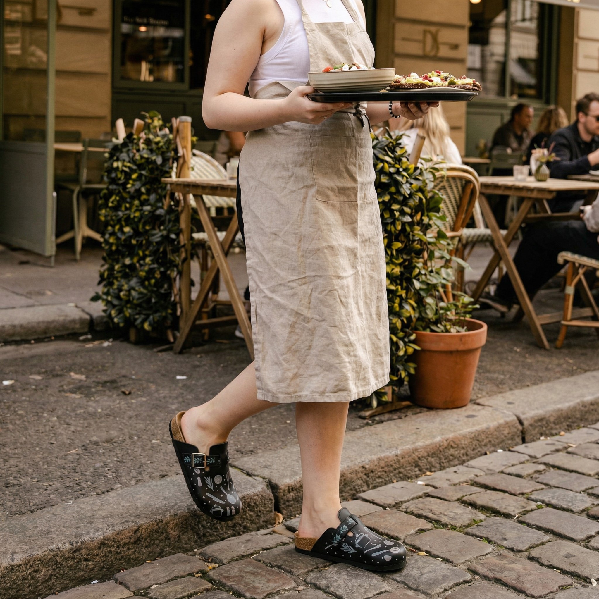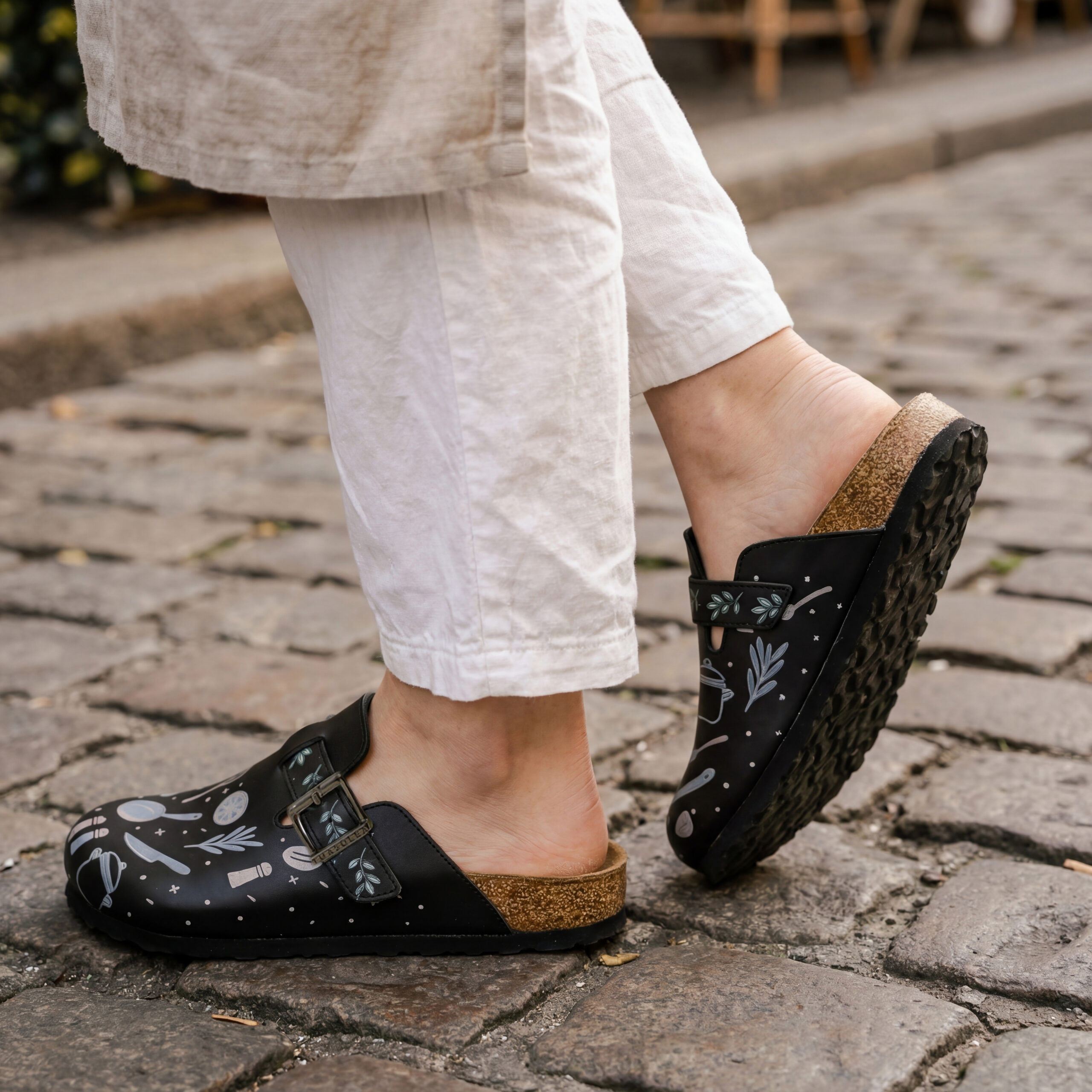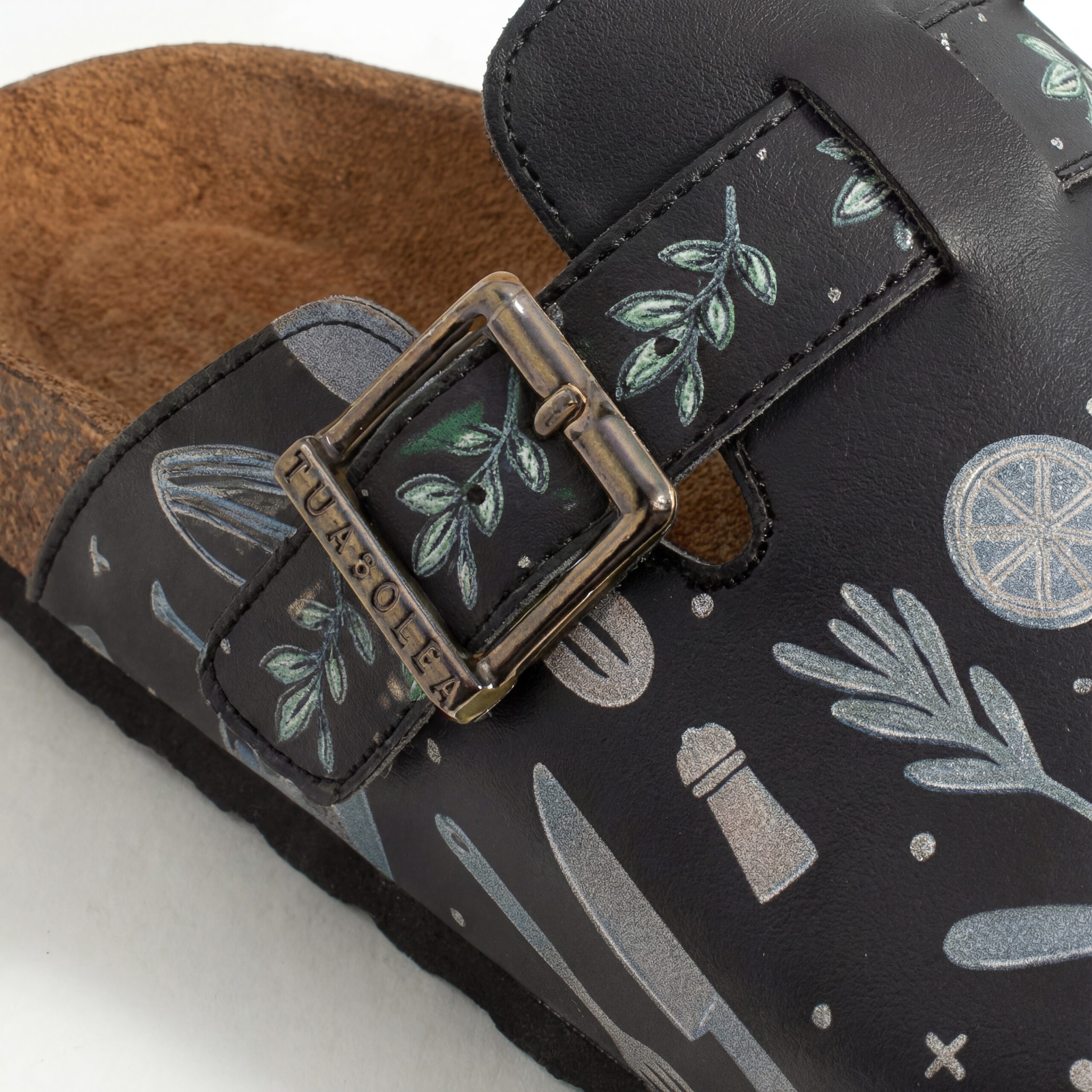 Изработени са от висококачествена еко кожа в черен цвят с дискретен кулинарен принт, който придава модерен и професионален вид. Материалът е устойчив на ежедневно натоварване, лесен за почистване и не задържа петна и неприятни миризми. Регулируемата метална катарама осигурява стабилно и индивидуално напасване към крака.